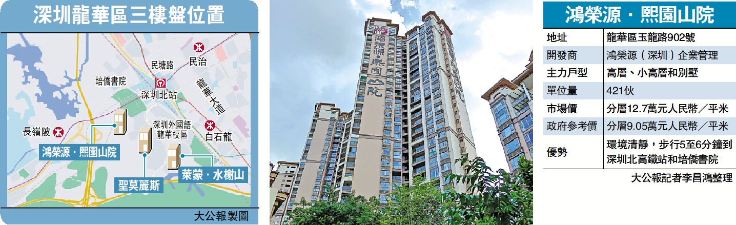 新學年即將到來,家長客早已四出尋找毗鄰優質學府的豪宅。鄰近深圳北高鐵站的深圳香港培僑書院龍華信義學校(下稱培僑書院)去年9月正式營辦,因其香港學術機構辦學背景,融合香港特區與深圳市教育局的兩種教學模式,吸引許多在深圳居住的港人購入或租住附近物業。深圳中原地產營業經理林輝透露,去年有家長斥資2000萬元(人民幣,下同)購入鄰近培橋書院的豪宅鴻榮源·熙園山院(下稱熙園山院)四房大單位,以方便小孩上學。\大公報記者 李昌鴻深圳報道(文、圖)
