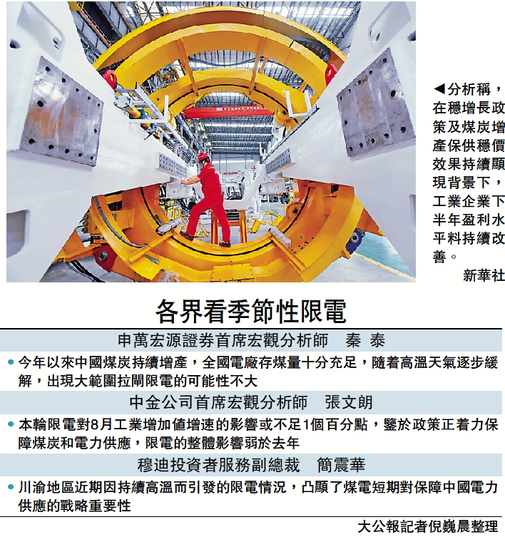 針對近期川渝等地區對工業企業實施限電,申萬宏源證券首席宏觀分析師秦泰坦言,南方地區超長期的極端高溫天氣引發「汛期乾旱」現象,對水電依賴度較高的川渝地區因此出現「結構性缺電」問題,這與去年的大範圍限電有本質的不同。他並指,今年以來中國煤炭持續增產,當前全國電廠存煤量十分充足,今年全國總體供電壓力弱於去年,「鑒於本月24日開始南方高溫天氣逐步緩解,居民用電需求極端高峰或逐步緩和,年內全國出現大範圍拉閘限電可能性不大。」