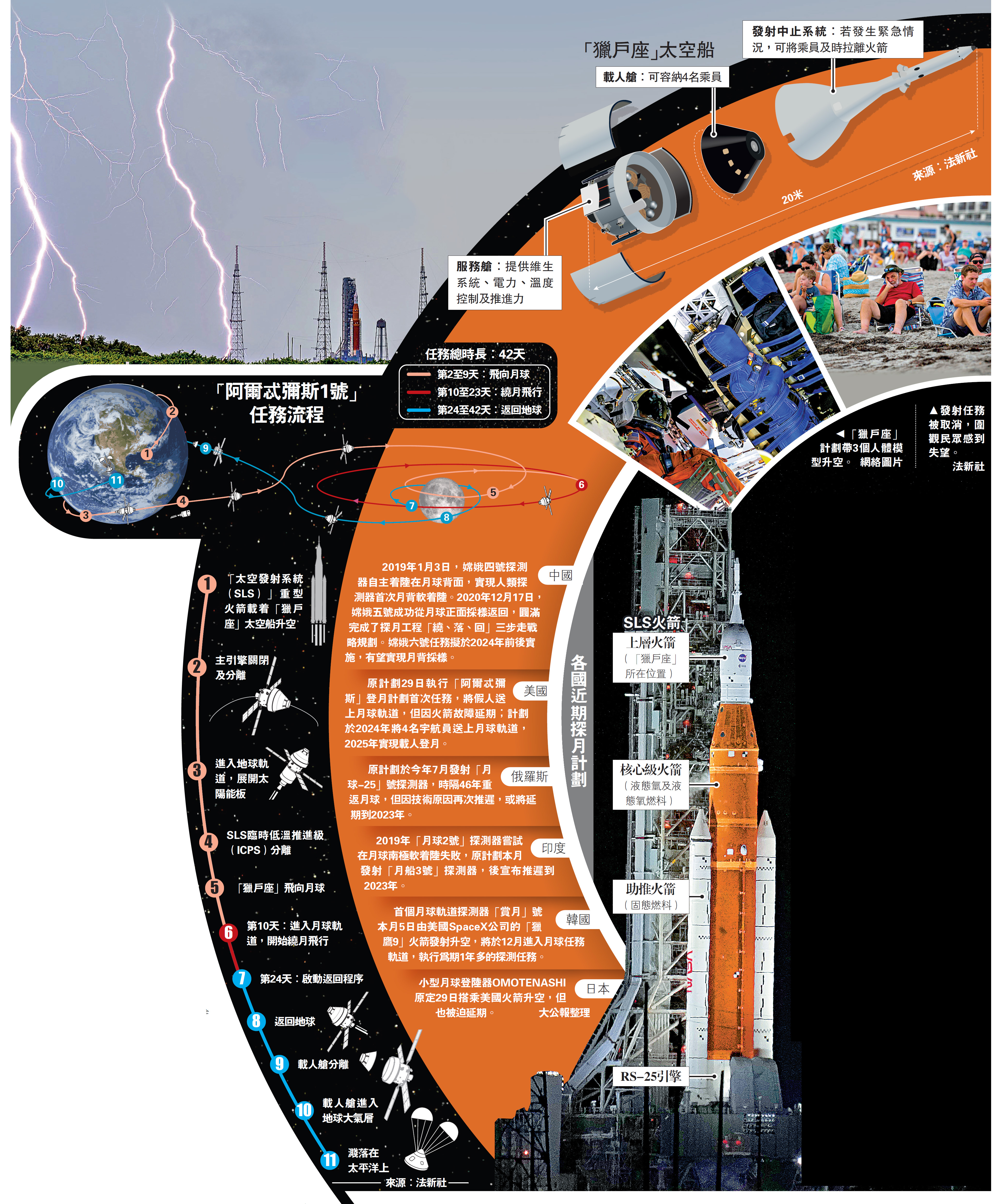 【大公報訊】綜合美聯社、《華盛頓郵報》、《衛報》報道:美國太空總署(NASA)原計劃於29日發射新一代登月火箭「太空發射系統」(SLS),將載着3個假人的「獵戶座」太空船送往月球軌道,邁出重返月球計劃的關鍵一步。然而,發射前48小時倒計時開始後,發射台多次遭遇雷擊,緊接着火箭又發生燃料洩漏和引擎故障,NASA不得不在最後一刻宣布推遲任務。下一次發射嘗試最早於9月2日進行。