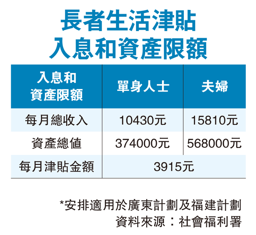 勞工及福利局在社交網頁發文提到,合併後的長者生活津貼,將劃一採用普通津貼較寬鬆資產上限,單身人士為37.4萬元,夫婦則為56.8萬元;合資格長者將一律發放高額津貼每月3915元;新安排同樣適用於廣東及福建計劃。