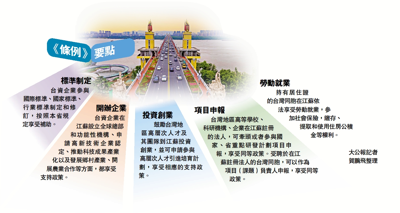 台資企業在江蘇設立全球總部和功能性機構、申請高新技術企業認定、推動科技成果產業化以及發展鄉村產業、開展農業合作等方面,都享受支持政策。