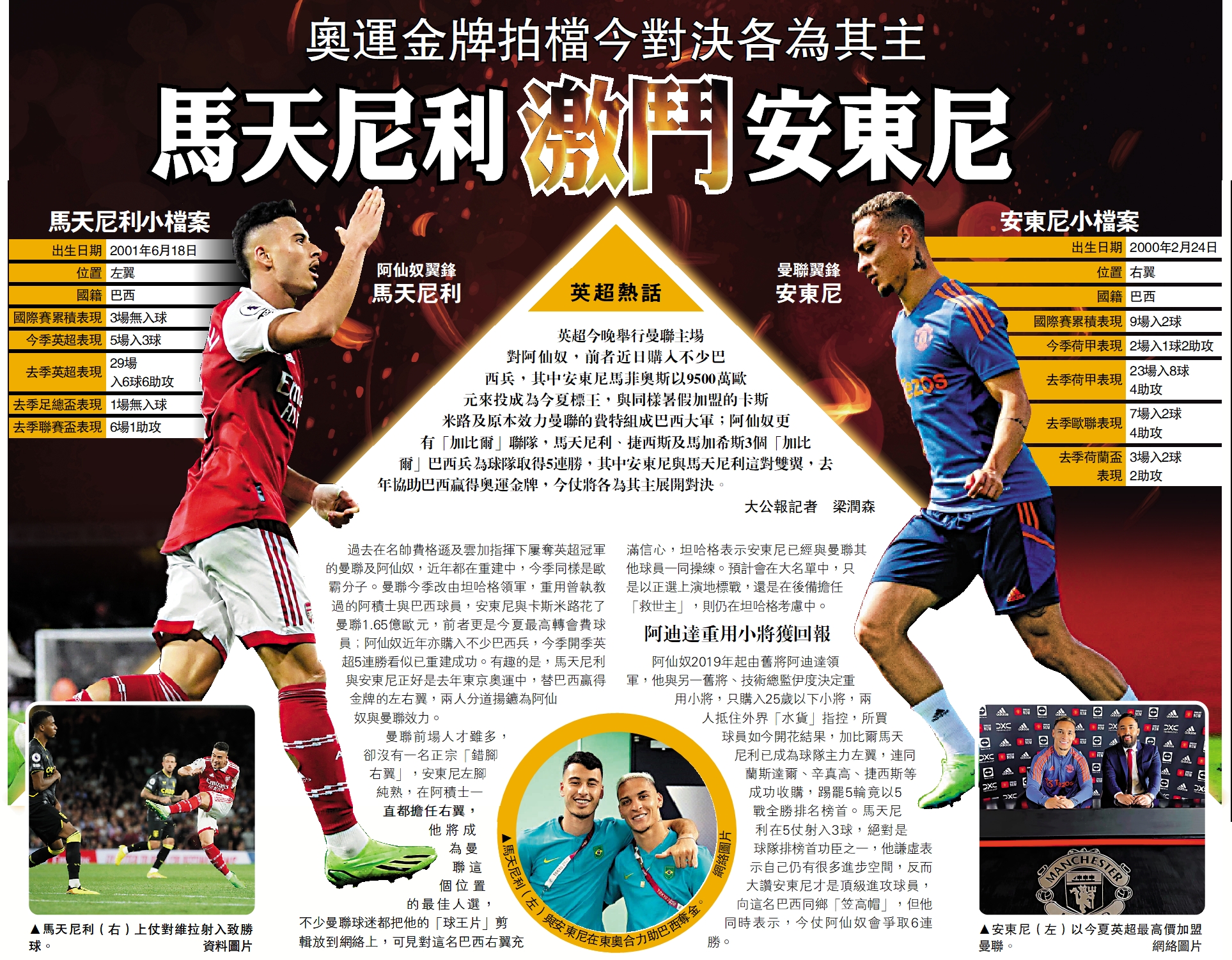 英超今晚舉行曼聯主場對阿仙奴,前者近日購入不少巴西兵,其中安東尼馬菲奧斯以9500萬歐元來投成為今夏標王,與同樣暑假加盟的卡斯米路及原本效力曼聯的費特組成巴西大軍;阿仙奴更有「加比爾」聯隊,馬天尼利、捷西斯及馬加希斯3個「加比爾」巴西兵為球隊取得5連勝,其中安東尼與馬天尼利這對雙翼,去年協助巴西贏得奧運金牌,今仗將各為其主展開對決。\大公報記者 梁潤森