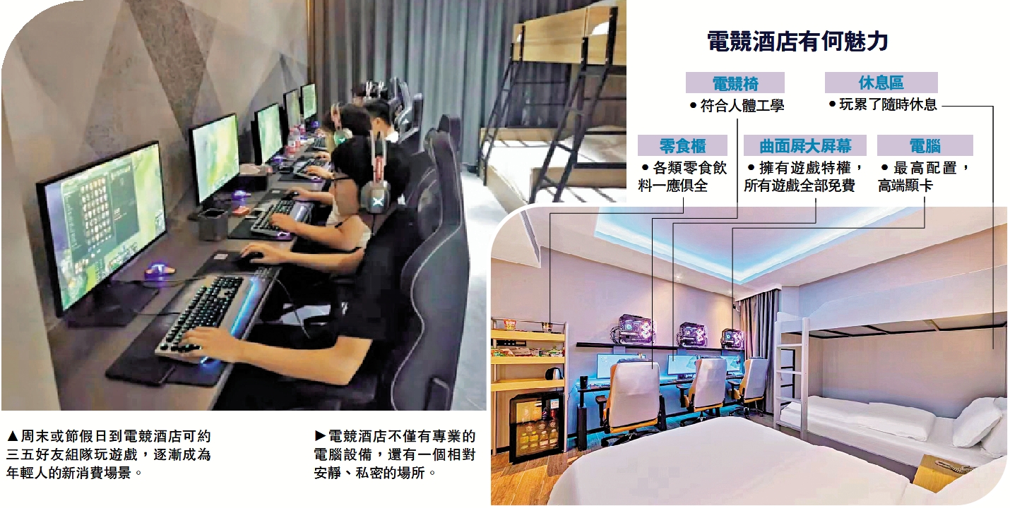 粵港澳大灣區電競業正逐漸成為年輕人的新消費場景。周末或節假日到電競酒店,就可約三五好友組隊玩遊戲,又不用離開所在城市,疲憊了還可以休息,舒適又愜意。也因此,入住「電競酒店」日漸成為年輕人的消閒新天地。隨着電競酒店普及,部分商家開始探索新板塊,除了電競服務外,消費者還可以在書吧嘆咖啡和健身,體驗遊藝時尚潮流,多元娛樂體驗更上一層樓。\大公報記者 盧靜怡、黃寶儀、胡永愛