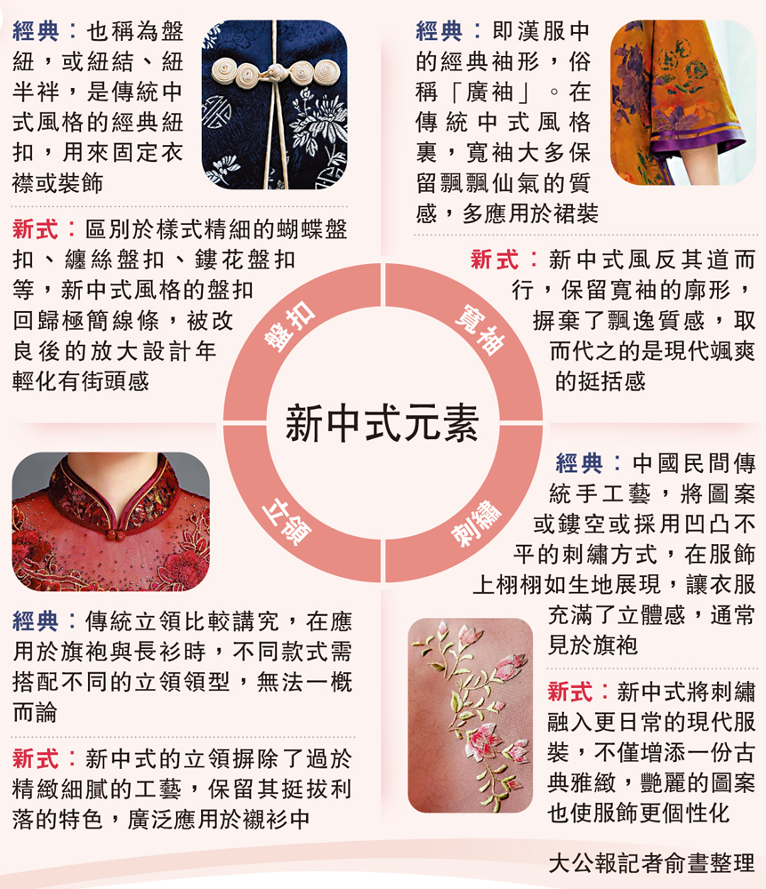 新式:新中式將刺繡融入更日常的現代服裝,不僅增添一份古典雅緻,艷麗的圖案也使服飾更個性化