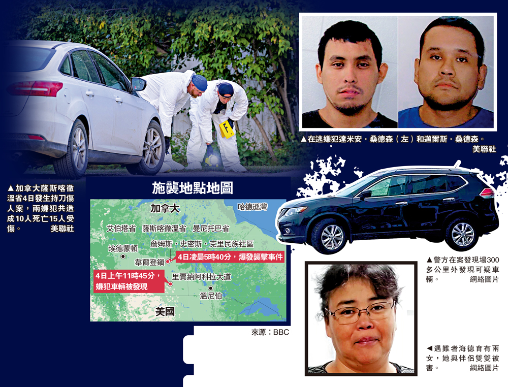 【大公報訊】綜合美聯社、BBC、《華盛頓郵報》報道:加拿大西部薩斯喀徹溫省(Saskatchewan)4日發生連環襲擊案,兩名男子持刀於當地一處原住民社區及附近城鎮犯下血案,所涉及的案發現場至少有13處,造成最少10死15傷。加拿大警方稱部分死傷者是嫌犯的特定目標,其餘為隨機挑選,由於兩名嫌犯仍然在逃,目前尚不清楚具體動機。
