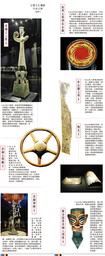 在三星堆博物館的綜合館展廳裏,有一面牆高低錯落地展示很多奇怪的符號,這些都是甲骨文、金文中各種「蜀」字的寫法。根據四川古史傳說和文獻記載,「蜀」是一個延續了近3000年的古代王國的稱號。為區別於此後四川以「蜀」為名的地方政權,故稱之為「古蜀」。由於文獻記載的語焉不詳,古蜀歷史「久遠隱沒,實多疏略」。\大公報記者 向芸(文、圖)