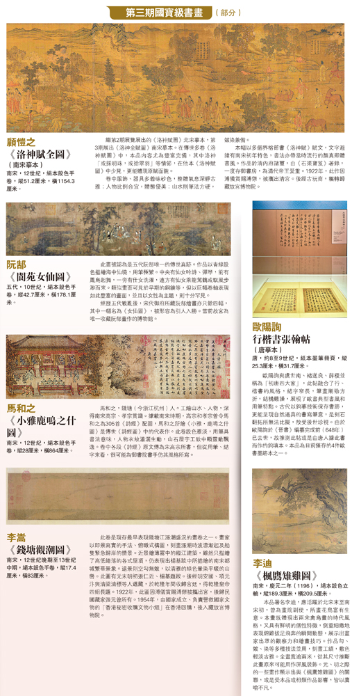 最後一期展品國寶雲集,包括有傳為東晉繪畫名家顧愷之的千古名作《洛神賦全圖》(南宋摹本)、唐代著名書法家歐陽詢的《行楷書張翰帖》(唐摹本)、五代畫家阮郜唯一的傳世真跡《閬苑女仙圖》、南宋著名畫家馬和之的《小雅鹿鳴之什圖》、南宋畫家李迪罕見的巨幅精品《楓鷹雉雞圖》,以及南宋宮廷畫家李嵩的《錢塘觀潮圖》等。