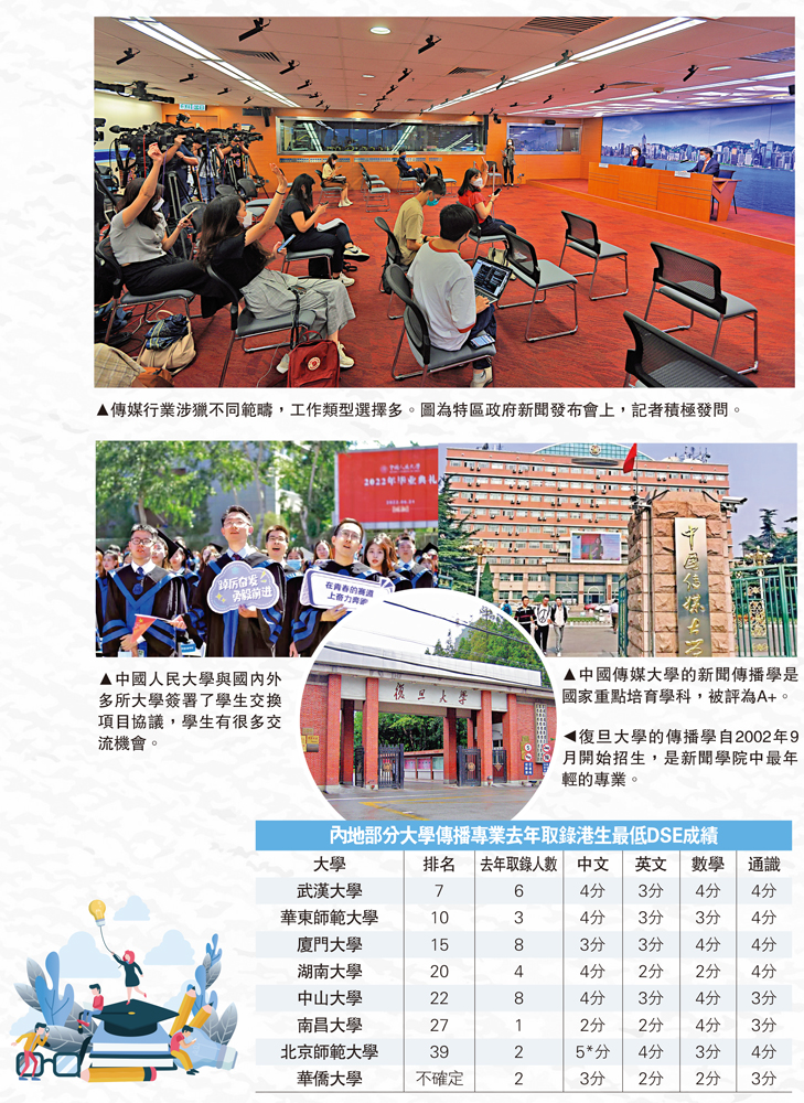 在2022/2023學年內地高校招收香港中學文憑考試學生計劃指南中,傳播學依然是港生申請的熱門科目,是次《大公報》介紹三所設有傳播學專業、且接受文憑試學生報讀的內地高校,讓同學們作參考。\大公報記者 蘇薇