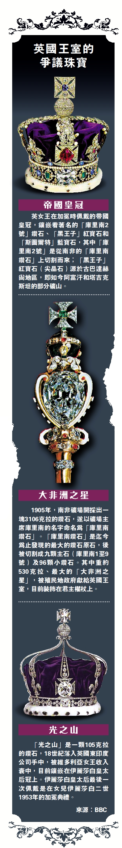 英女王在加冕時佩戴的帝國皇冠,鑲嵌着著名的「庫里南2號」鑽石、「黑王子」紅寶石和「斯圖爾特」藍寶石,其中「庫里南2號」是從南非的「庫里南鑽石」上切割而來;「黑王子」紅寶石(尖晶石)源於古巴達赫尚地區,即如今阿富汗和塔吉克斯坦的部分礦山。
