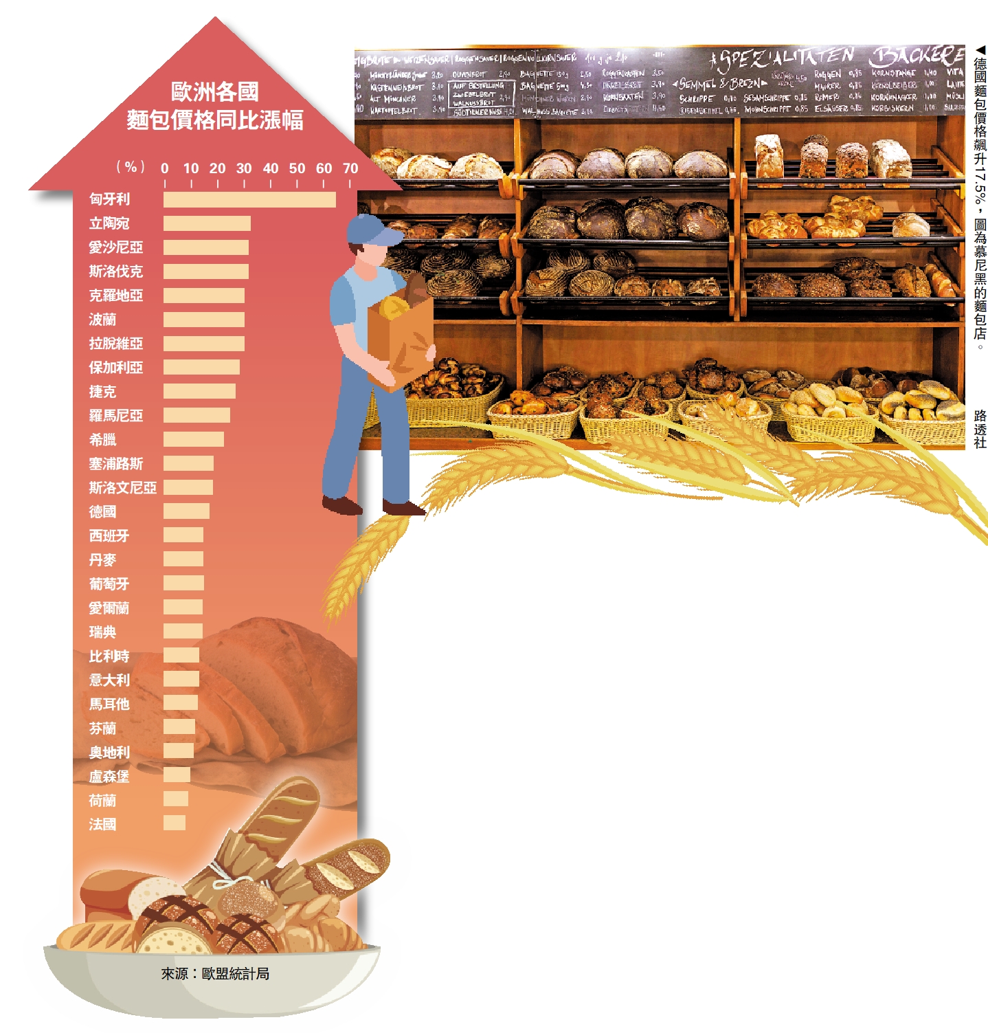 【大公報訊】綜合路透社、Politico、《商業內幕》報道:歐盟統計局19日發布的數據顯示,歐盟8月的麵包價格比一年前平均上漲18%,與去年8月漲幅3%相比,一年來的變化十分驚人。歐盟成員國中以匈牙利麵包飆漲66%為最高,法國8%最低。分析指,歐洲以麵包為主食,麵包價格是足以「動搖國本」的問題。