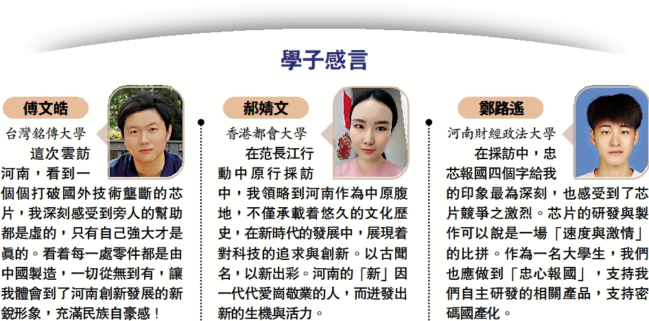 這次雲訪河南,看到一個個打破國外技術壟斷的芯片,我深刻感受到旁人的幫助都是虛的,只有自己強大才是真的。看着每一處零件都是由中國製造,一切從無到有,讓我體會到了河南創新發展的新銳形象,充滿民族自豪感!