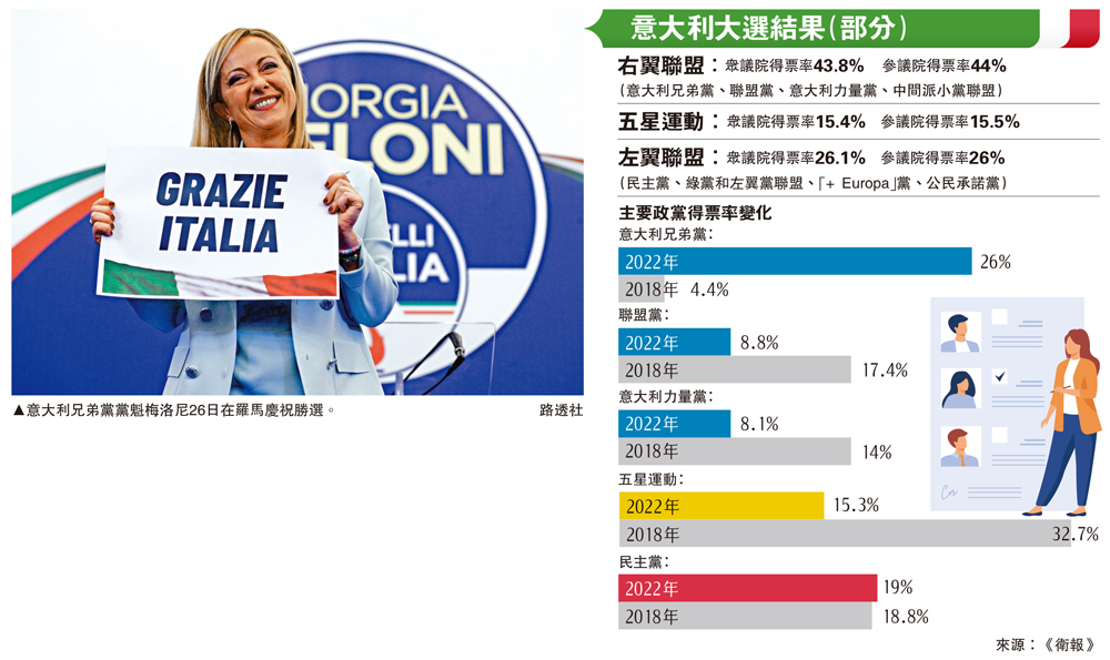 意大利本屆大選投票率不足64%,創歷史新低。意內政部當天發布了對超過90%國內選票的計票結果,顯示由意大利兄弟黨、聯盟黨和意大利力量黨等組成的右翼聯盟得票率最高,約為44%,這意味着右翼將掌控參眾兩院。意大利兄弟黨從上屆大選僅獲得4.4%選票的小黨,一躍成為得票率26%的最大黨。外界普遍預測梅洛尼將出任總理。她26日宣布勝選,並強調會努力團結國家,不辜負民眾信任。