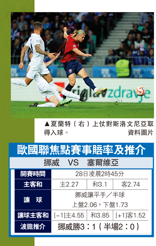 【大公報訊】綜合ESPN FC、香港賽馬會足智彩報道:歐國聯B4組末輪賽事挪威主場對塞爾維亞明晨打響,今仗是雙方的升班大戰,目前兩隊同積10分,不過首循環挪威曾擊敗塞爾維亞,因此在對賽成績佔優,令後者今仗非勝不可,惟他們卻難以看管效力曼城的挪威王牌前鋒夏蘭特,或因此進退失據。讓球挪威讓平/半仍可買上盤一博。
