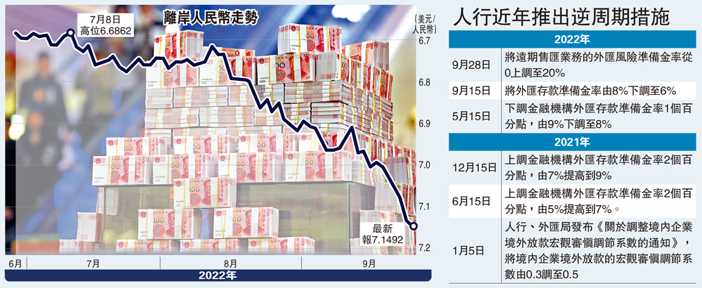 調升遠期售匯風險準備金率還讓銀行代客遠期售匯業務成本明顯提高,抑制投機者通過遠期售匯做空人民幣的動力。人行昨日發布該措施後,離岸人民幣短線一度拉升逾300點見7.13水平。惟美匯升勢持續,隨後離岸人民幣兌美元在7.14至7.17水平徘徊。