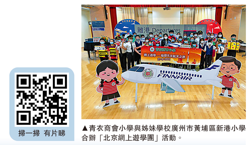 【大公報訊】記者蘇薇報道:疫情無阻香港與內地的學生交流,青衣商會小學與姊妹學校廣州市黃埔區新港小學於昨日合辦「北京網上遊學團」活動,帶領同學一路「飛」到北京旅遊,學習有關航天科技的知識。活動過程中有不同學生扮演各種角色,在學習知識的同時也體驗不同的職業生涯。青衣商會小學校長文潔碧表示,希望可以藉此類活動提升學生的家國情懷,增進兩地師生友誼。