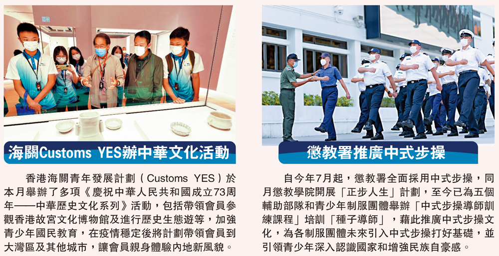 香港海關青年發展計劃(Customs YES)於本月舉辦了多項《慶祝中華人民共和國成立73周年——中華歷史文化系列》活動,包括帶領會員參觀香港故宮文化博物館及進行歷史生態遊等,加強青少年國民教育,在疫情穩定後將計劃帶領會員到大灣區及其他城市,讓會員親身體驗內地新風貌。