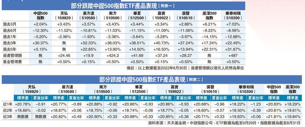 至於添富800ETF的績效,截至6月底止,1個月、6個月、12個月回報率為6.2%、-8.8%、-9.8%。另外,近1年、近2年的標準差為18.23%、17.88%;夏普比率-1.12、-0.30。當對照附表一、附表二,見到添富800ETF在前述各項指標都介乎中證500指數ETF與滬深300指數ETF之間。作為覆蓋中證500指數、滬深300指數成份股,添富800ETF屬於稱職產品。