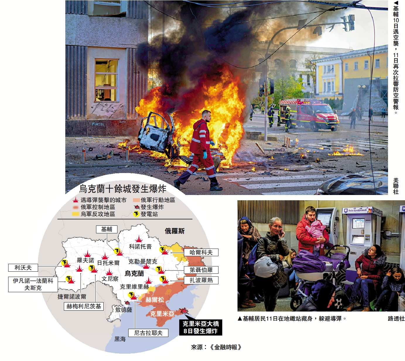 【大公報訊】綜合CNN、《華盛頓郵報》、今日俄羅斯報道:俄羅斯10日發射導彈打擊烏克蘭境內十多座城市,11日繼續打擊烏能源設施和軍事目標,烏全境拉響空襲警報。烏方稱,空襲已導致19人死亡,逾百人受傷,超過300個地區斷電。美歐多國宣稱將向烏克蘭提供更多先進武器。俄方警告稱,西方正越來越多地捲入這場衝突,俄方將不得不採取必要的反制措施。美媒表示,烏克蘭局勢迎來危險的轉折點,存在衝突擴大化風險。