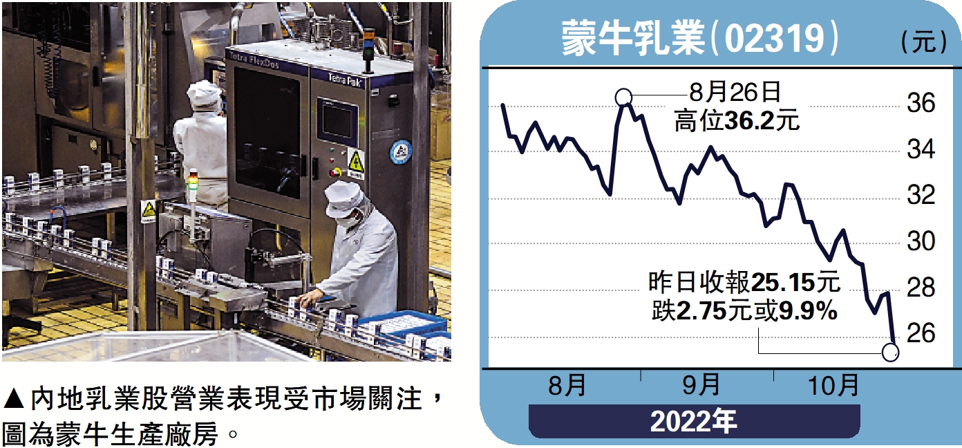 蒙牛股價昨日最多挫10.8%,低見24.9元的逾兩年半低位,收報25.15元,跌9.9%。