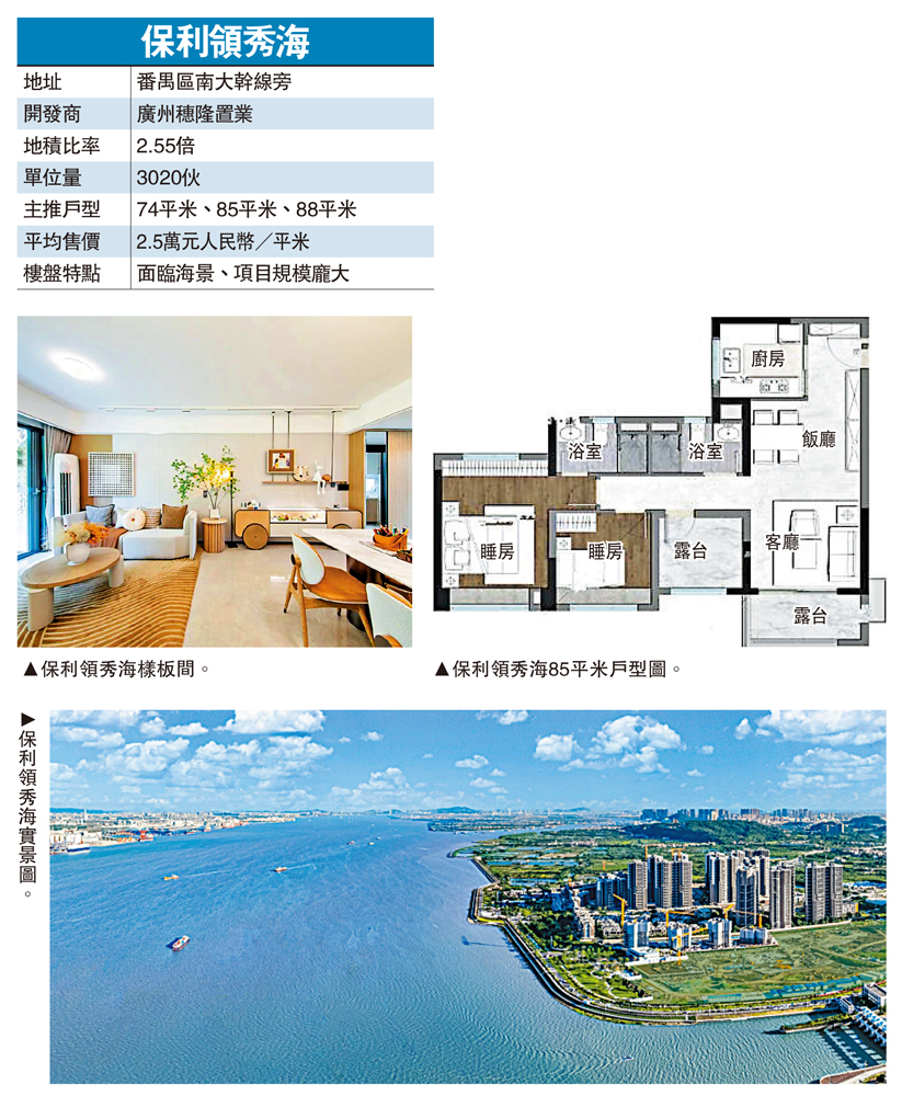 保利領秀海每平米單價2.5萬元(人民幣,下同),推出的戶型建築面積包括74、84、95、120、126、139平米3至4房設計,囊括了剛需到改善型買家的需求,不到200萬元(約217萬港元)就能購入海景房,開闊的看海視野,直追香港淺水灣的豪宅。