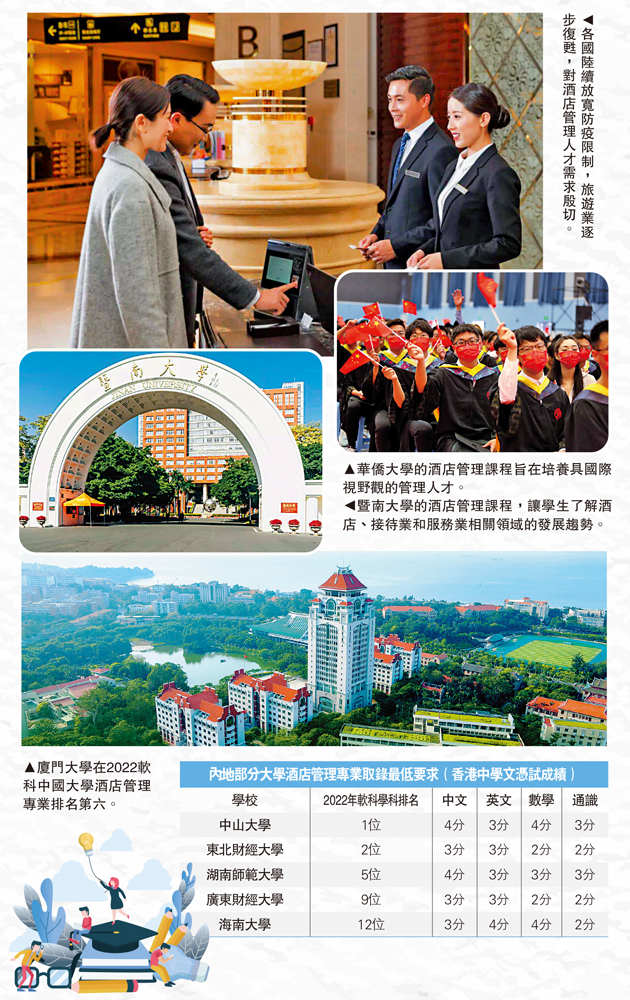 隨着各國陸續放寬防疫限制,本港旅遊業亦正逐步復甦,對酒店管理人才渴求。酒店管理是一個充滿生命力、蓬勃發展的行業,有意就讀該專業的同學可學習到商業、旅遊業及服務業等多學科的知識,畢業後可向多方面發展。今期《大公報》介紹三間位於內地沿海城市、且開辦酒店管理專業的高校,包括暨南大學、廈門大學及華僑大學,供同學們參考。\大公報記者蘇薇