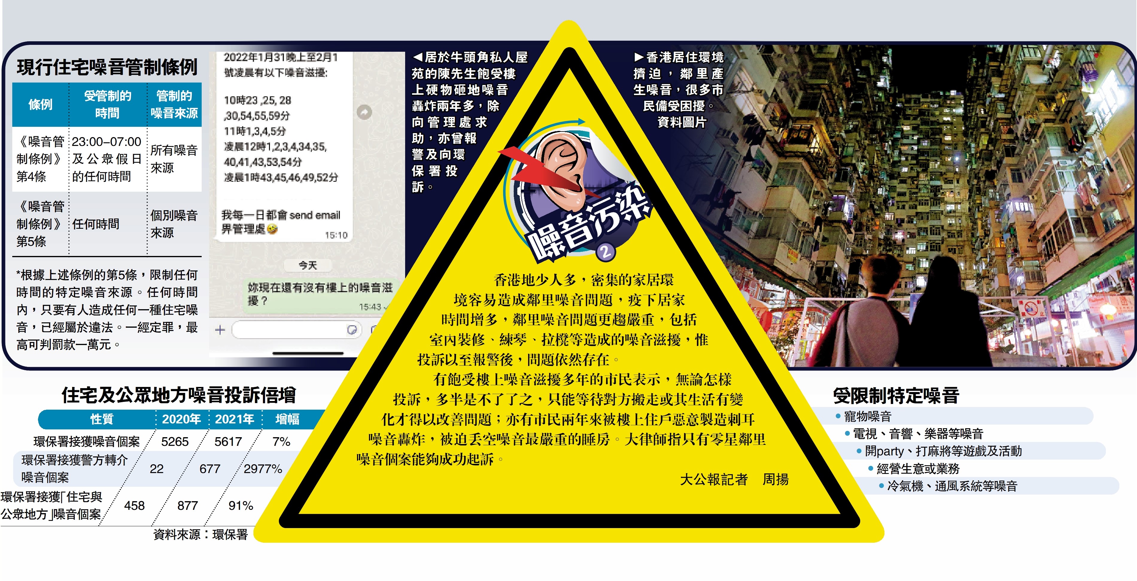 香港地少人多,密集的家居環境容易造成鄰里噪音問題,疫下居家時間增多,鄰里噪音問題更趨嚴重,包括室內裝修、練琴、拉櫈等造成的噪音滋擾,惟投訴以至報警後,問題依然存在。