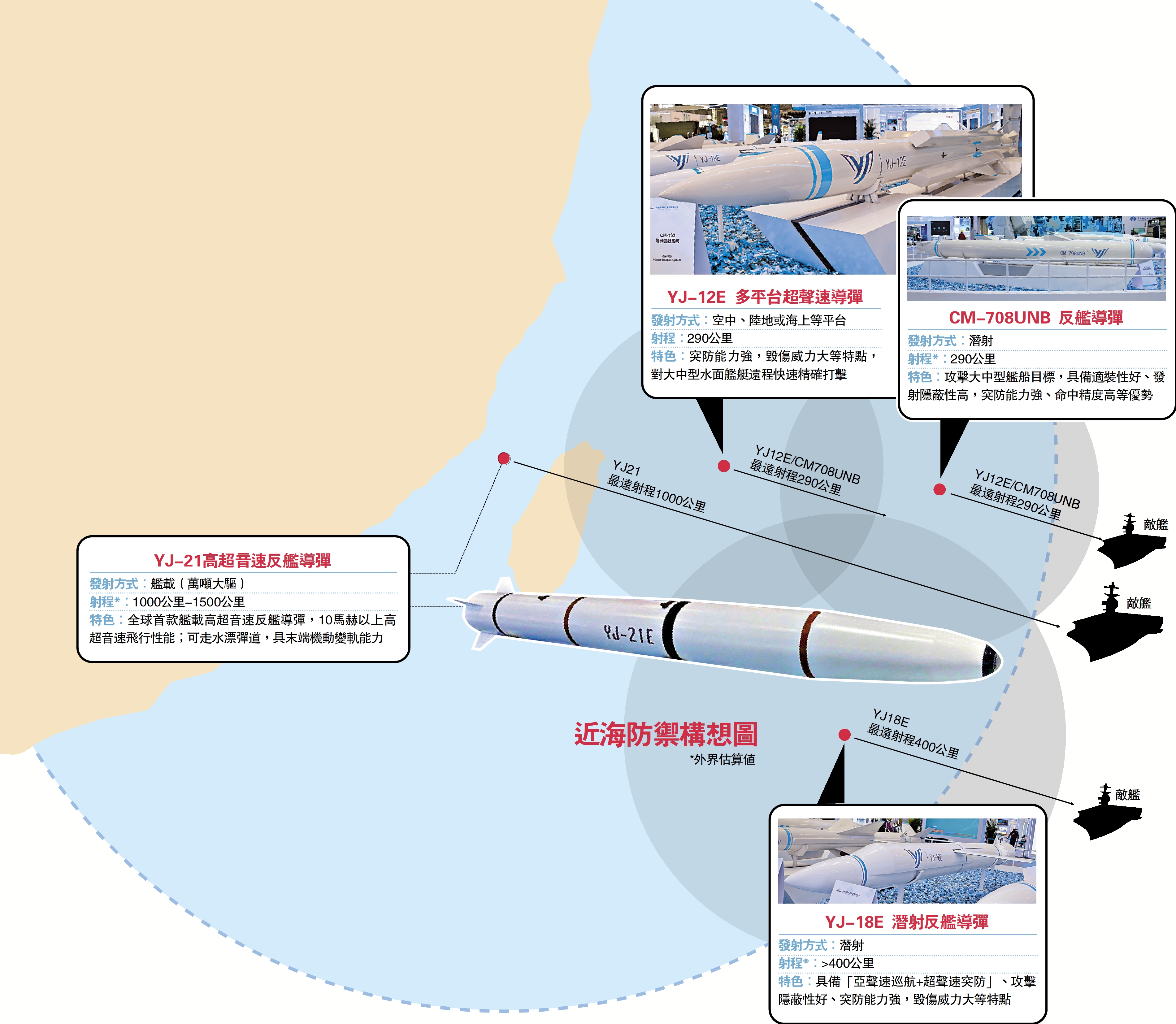 作為近海防禦的大利器,YJ-18E導彈武器系統採用「亞聲速巡航+超聲速打擊」體制,兼顧亞聲速大航程、末段超聲速攻擊的獨特優勢,可遠程隱蔽打擊大中型水面艦艇及編隊,並具有攻擊小型艦艇以及陸上固定目標的能力。同樣主要用於潛艇水下隱蔽遠程攻擊的CM-708UNB,攜手YJ-18E成為攻擊敵方航母的協同作戰「組合」。而YJ-12E可從空中、陸地或海上多種平台發射,並在擊中目標前可執行「空中蛇形機動」,具備優異的突防能力以及毀傷威力大、命中精度高等特點,是實現遠程快速精確打擊的有力武器。