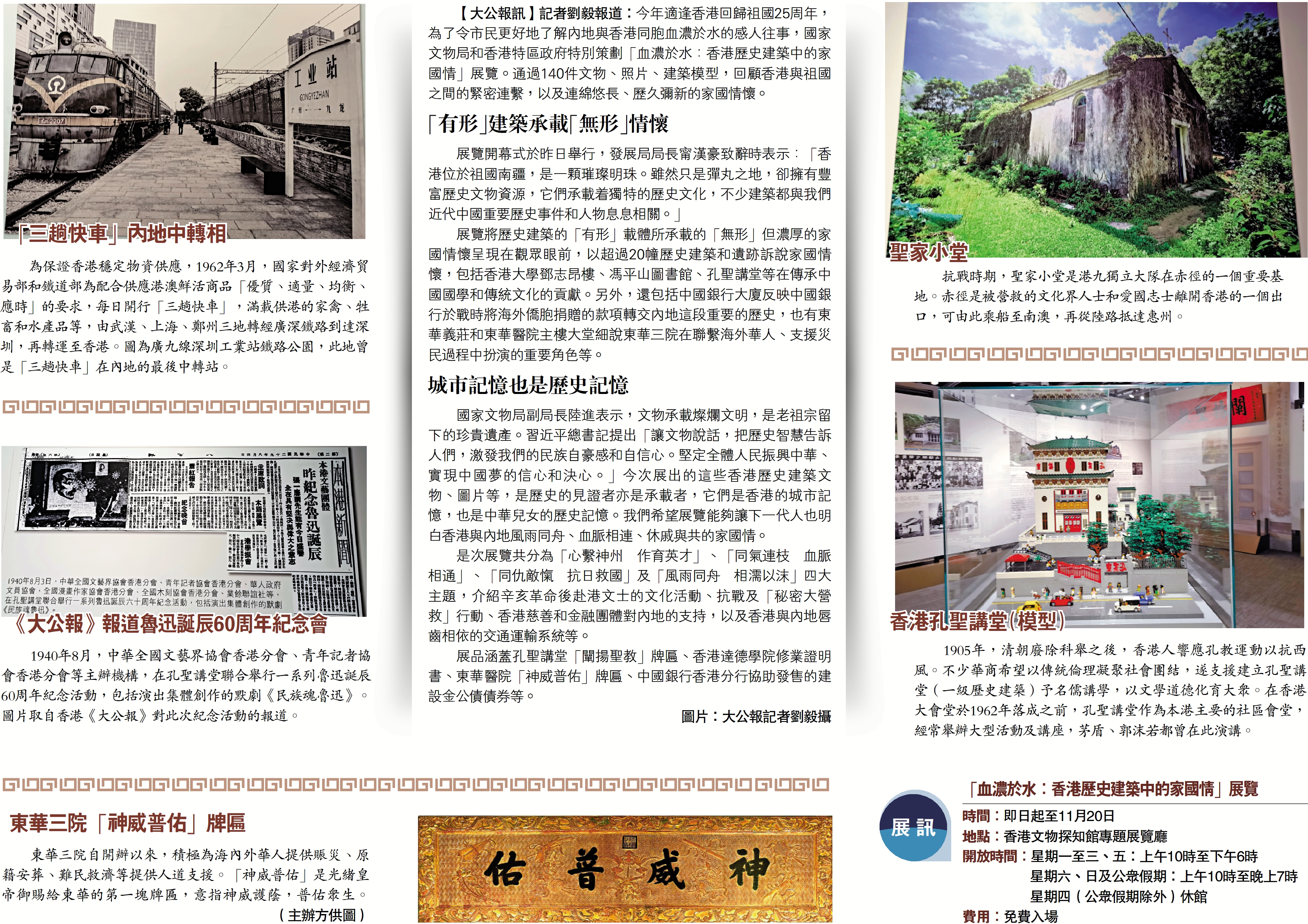 【大公報訊】記者劉毅報道:今年適逢香港回歸祖國25周年,為了令市民更好地了解內地與香港同胞血濃於水的感人往事,國家文物局和香港特區政府特別策劃「血濃於水:香港歷史建築中的家國情」展覽。通過140件文物、照片、建築模型,回顧香港與祖國之間的緊密連繫,以及連綿悠長、歷久彌新的家國情懷。