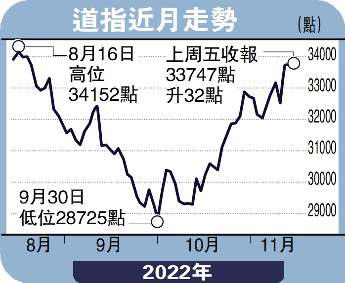 從11月初開始,美國10月失業率輕微上升至3.6%,及10月非農就業新增職位人數降低至20萬,連續四個月下跌後,至過去周四,美國消費者物價指數(CPI)較市場普遍預期回落,引發市場對美聯儲將很快放緩緊縮政策的希望,美股市場維持反彈格局。道指上周合共上漲4.15%或1344點,收報33747點;標普500全周上漲5.9%,收報3992點,升幅相對大於道指;納斯達克指數全周升8.84%,收報11323點。