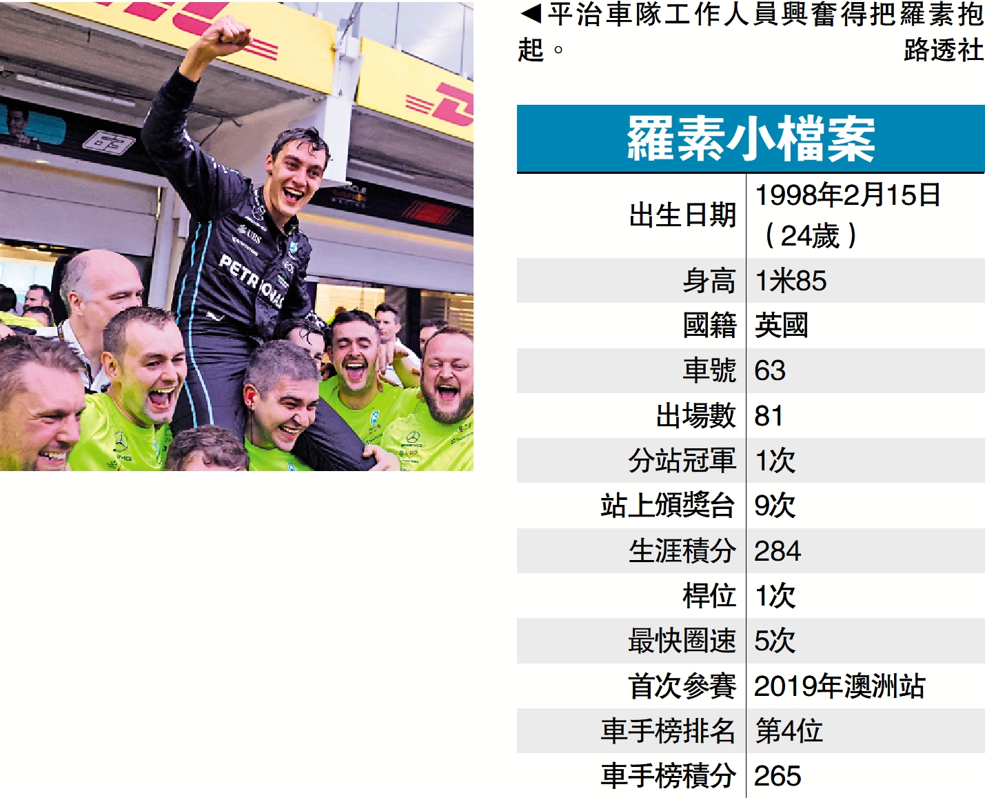 24歲的佐治羅素於2019年澳洲站開始踏上F1生涯,他由威廉士車隊出道至今已轉投平治車隊,過去出戰80次都未曾贏過分站冠軍,他在今站表現突出,甚至更勝實力出眾的隊友咸美頓,最終佐治羅素取得生涯首個分站冠軍,成為F1歷史上第113位分站冠軍得主,這亦是平治車隊今季首個分站冠軍。