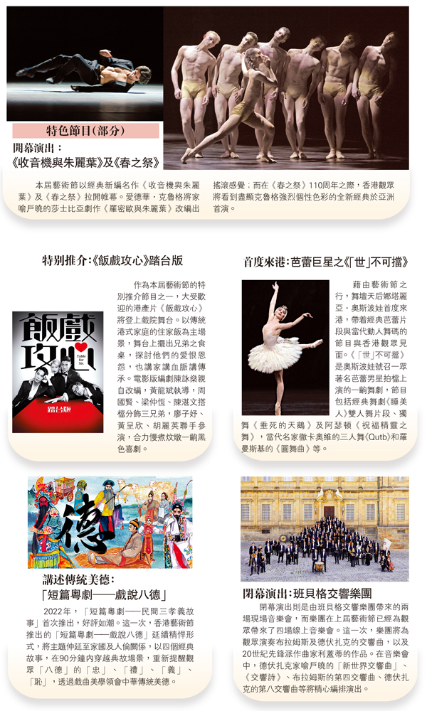 第51屆香港藝術節以「回賞·前行」為主題,籌備一系列舞蹈、歌劇、音樂劇、音樂、戲劇、戲曲等節目,在明年2月至3月為觀眾帶來久違的藝術盛宴。2020年,香港藝術節因疫情而取消,此後兩年,則改為線上線下混合模式舉行。隨着疫情的好轉,世界級藝術家藉着藝術節的機會來到香港表演,為香港的藝術發展增添新力量。門票將於12月7日公開發售。\大公報記者 顏琨