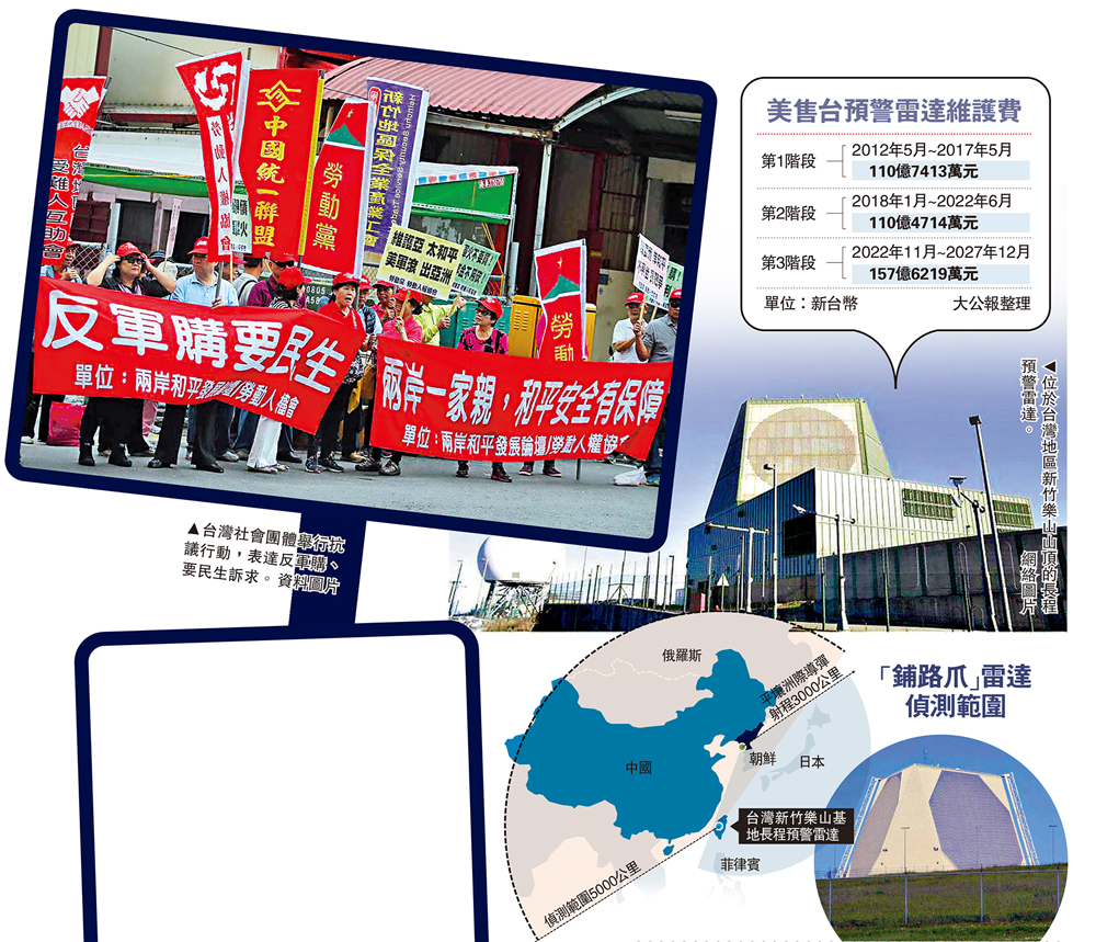台灣防務部門日前公布,台美雙方已簽署金額高達157.6億元新台幣(約39.7億港元)的「長程預警雷達系統」第三階段後續維持案。對此,國台辦發言人馬曉光16日在例行新聞發布會上回應指出,這157億元台幣用來改善民生、發展經濟,難道不比白白奉送給美國人強嗎?民進黨當局應該清楚,謀「獨」挑釁沒有出路,企圖依仗外部勢力「以武謀獨」,只能進一步加速自身滅亡。要想緩和兩岸關係、穩定台海局勢,那就回到「九二共識」的共同基礎上來,捨此別無他途。\大公報記者 朱燁北京報道