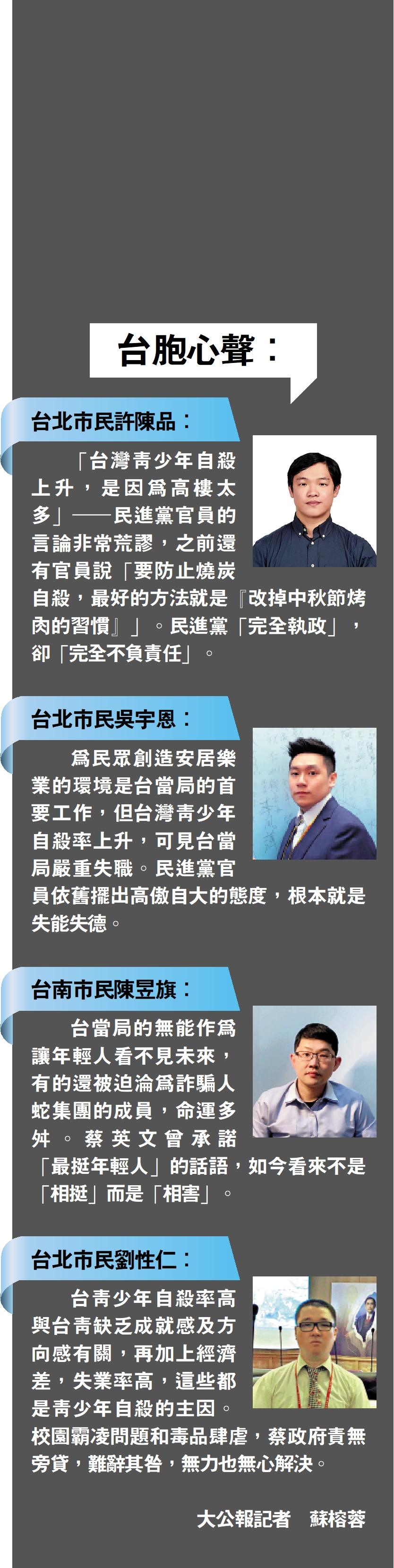 台青少年自殺率高與台青缺乏成就感及方向感有關,再加上經濟差,失業率高,這些都是青少年自殺的主因。校園霸凌問題和毒品肆虐,蔡政府責無旁貸,難辭其咎,無力也無心解決。