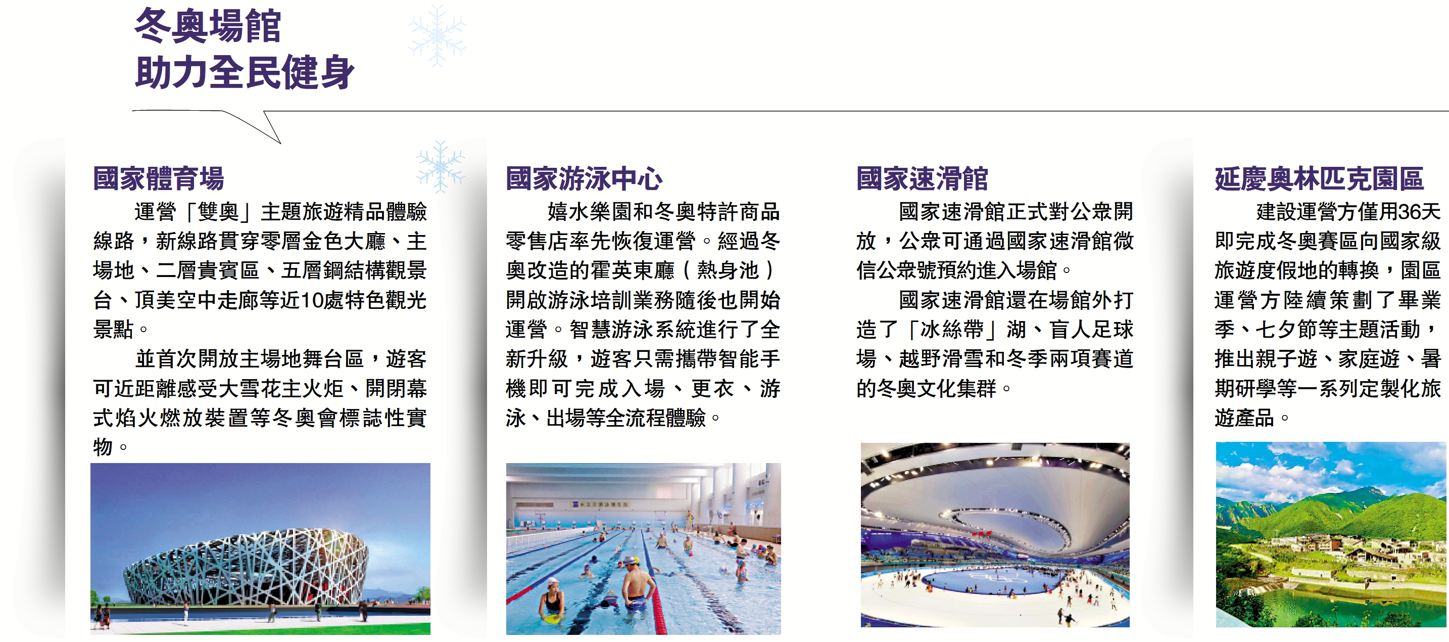 運營「雙奧」主題旅遊精品體驗線路,新線路貫穿零層金色大廳、主場地、二層貴賓區、五層鋼結構觀景台、頂美空中走廊等近10處特色觀光景點。