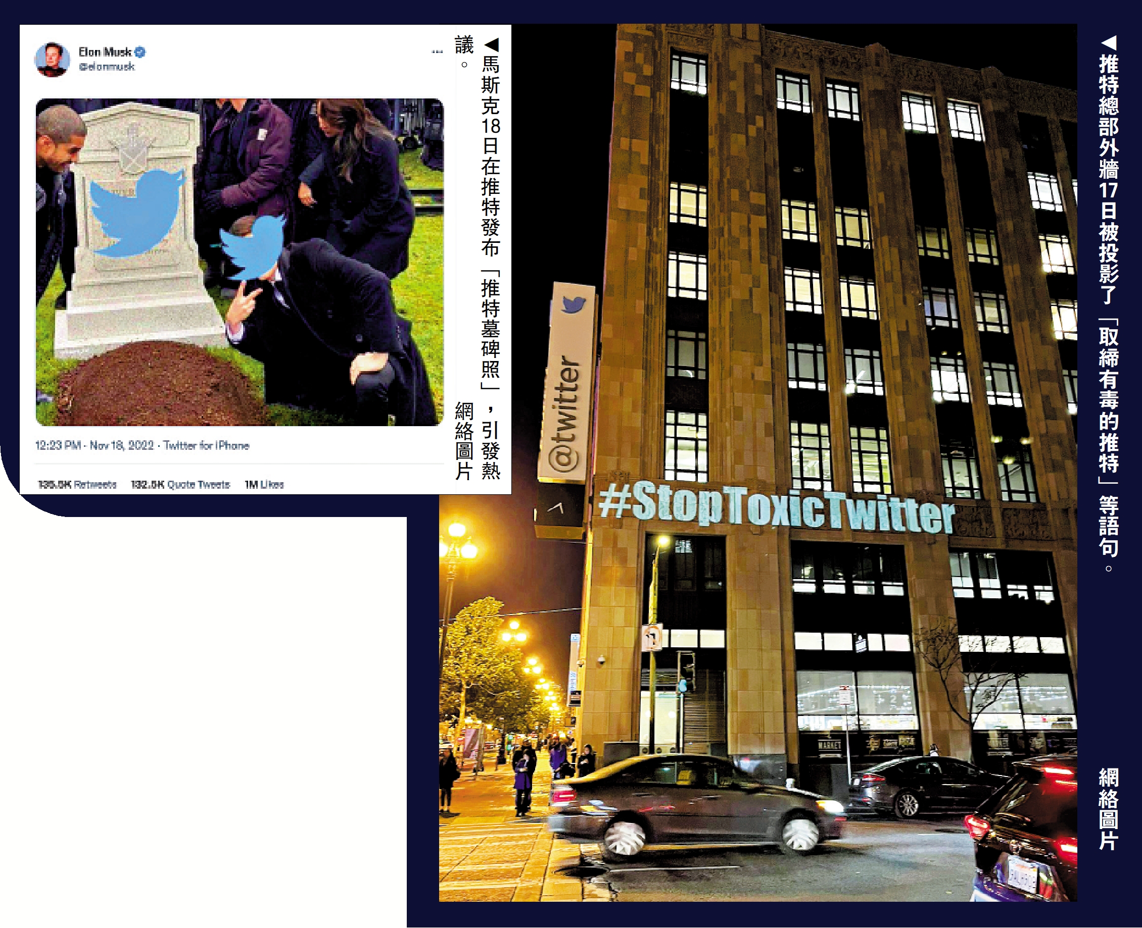 【大公報訊】綜合彭博社、路透社、美聯社報道:世界首富馬斯克對社交媒體推特(Twitter)收購之後的改造計劃已變成一場鬧劇。16日,馬斯克向所有員工下達「最後通牒」,要求他們簽署「自願長時間高強度工作」的保證書,否則就捲鋪蓋走人。由於拒絕簽署的員工數量遠超馬斯克預期,Twitter陷入混亂,17日突然宣布封鎖所有辦公樓至21日。據報道,馬斯克害怕心懷不滿的員工破壞公司財產,同時Twitter需要搞清楚還剩下多少員工。