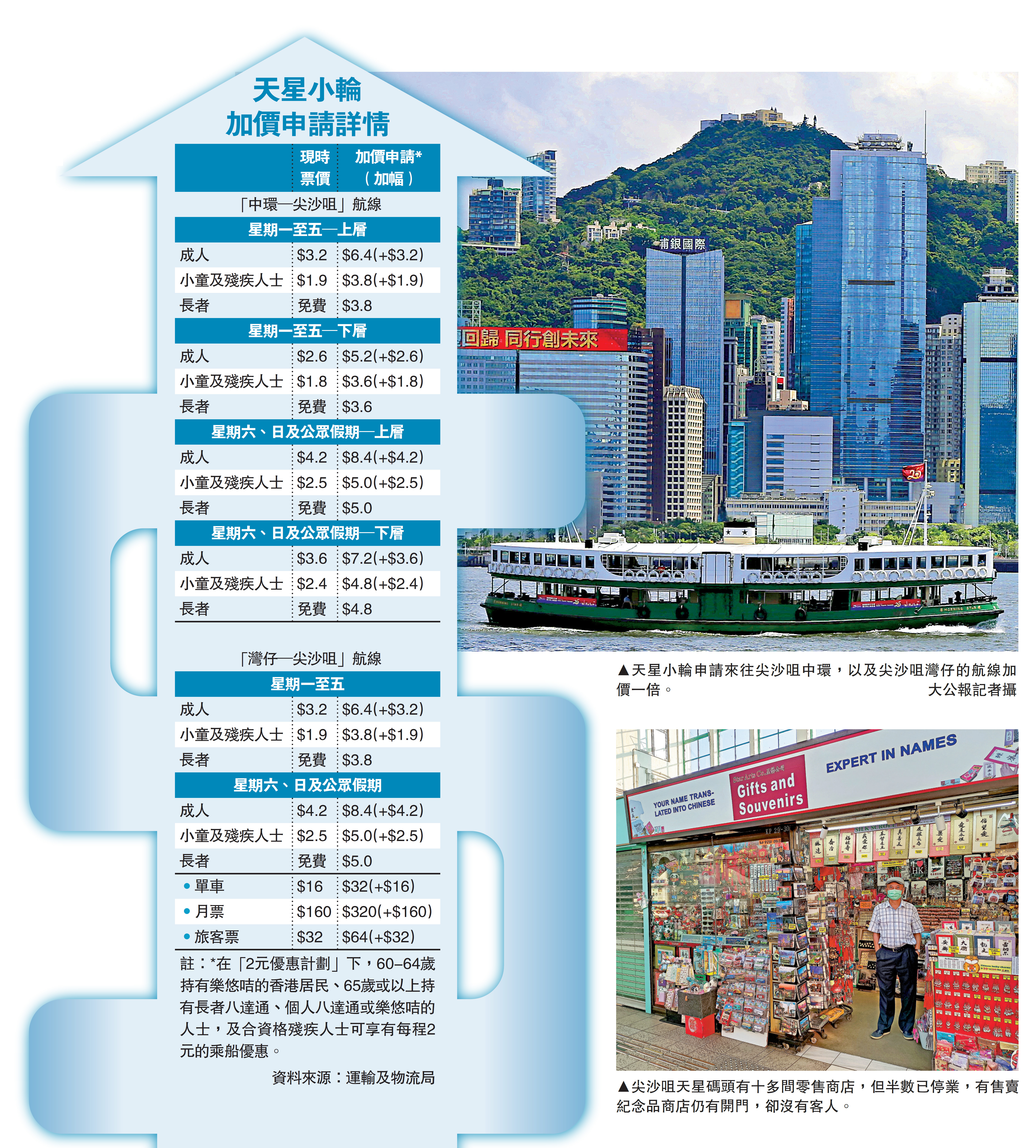 自2018年開始連年虧損,需依靠債務來維持專營航線服務的天星小輪,申請加價一倍,兩條專營航線即「中環─尖沙咀」及「灣仔─尖沙咀」每程的票價加1.8元至4.2元。成人平日上層票價由3.2元加至6.4元,下層由2.6元加至5.2元;星期六、日及公眾假期成人票價上層由4.2元加至8.4元,下層由3.6元加至7.2元。天星小輪亦申請改以2元長者優惠票價取代長者免費乘船優惠;天星小輪或不再是最便宜的「過海」交通工具。