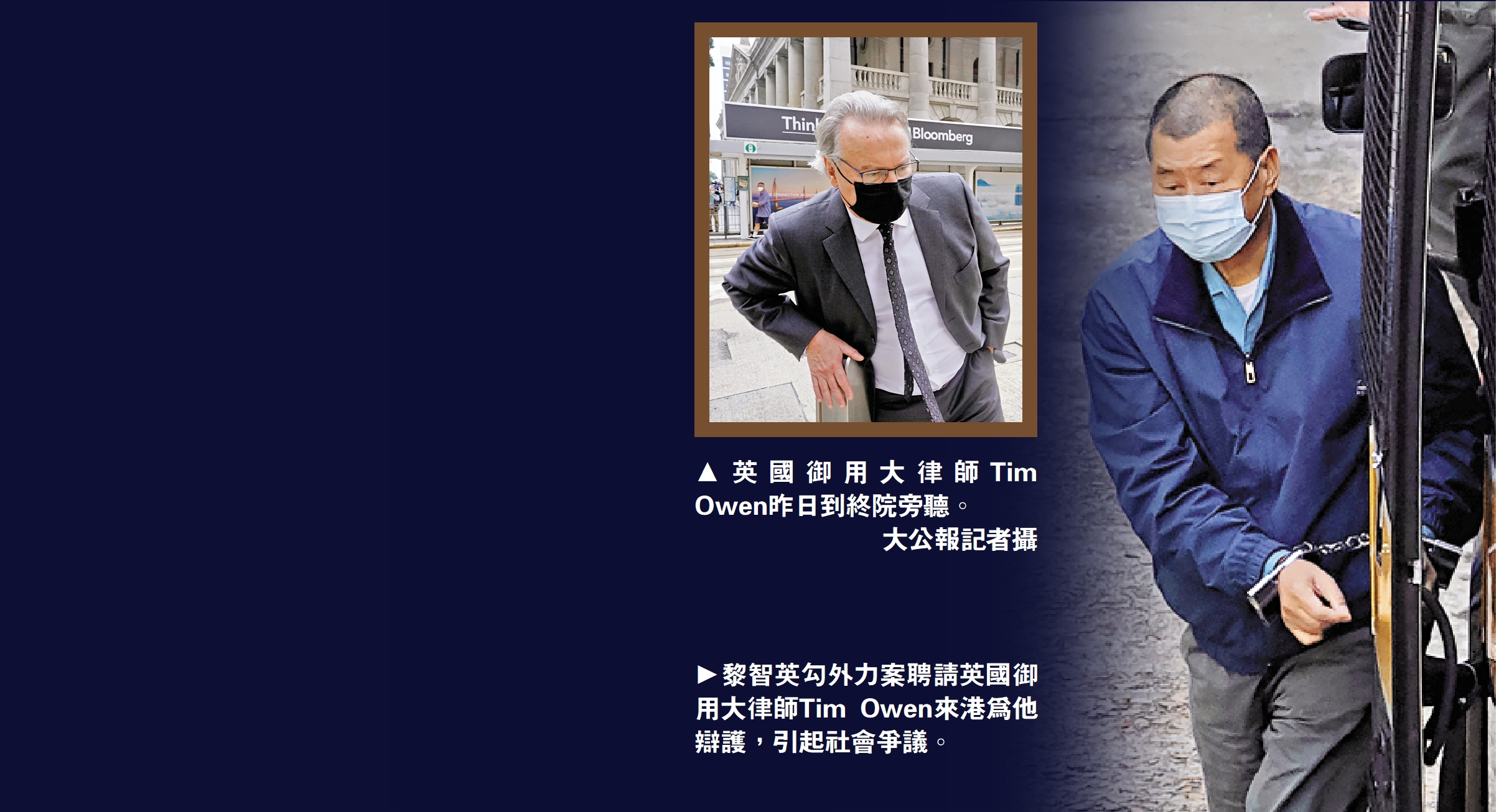 右圖:黎智英勾外力案聘請英國御用大律師Tim Owen來港為他辯護,引起社會爭議。