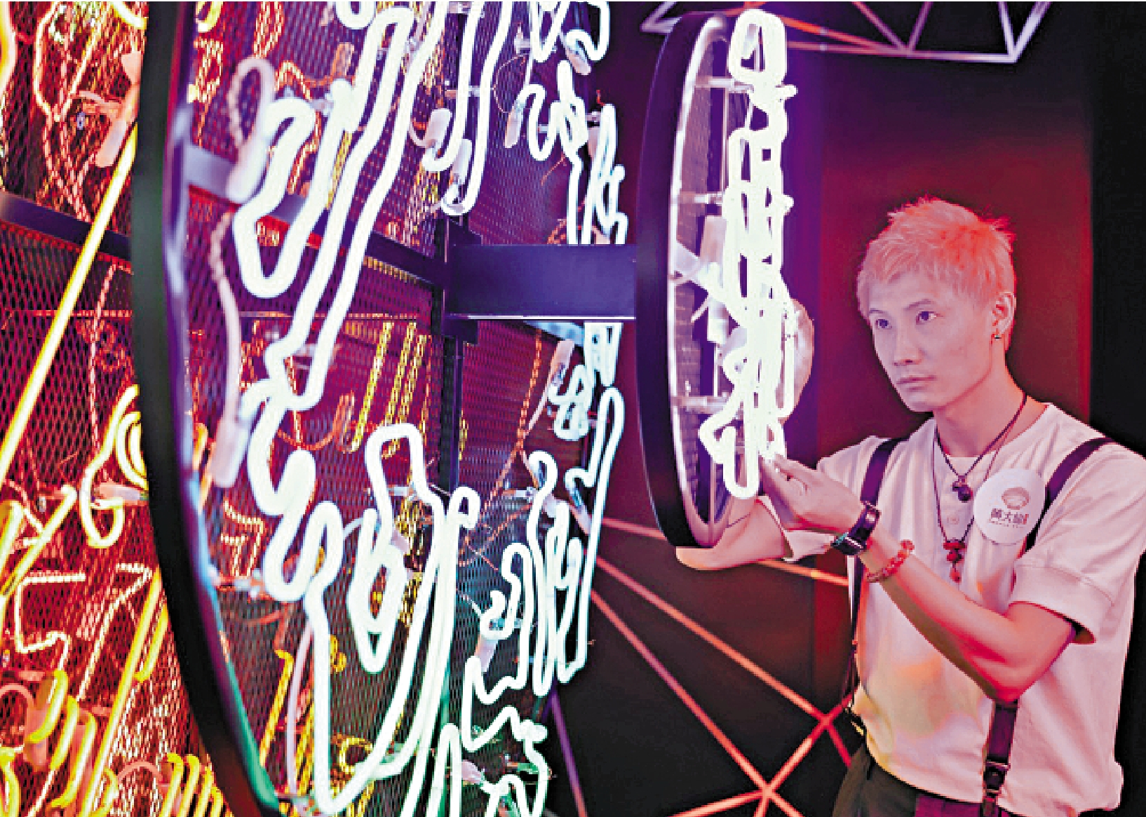 今年上半年,第五波疫情殺到香港,他見到市面上有不少吉舖,「二三月份完全沒有收入。」疫情下,無工開,他就多創作作品。其間,他所在「九龍霓虹」與ReadyVR合作創作作品《霓虹狂想》,以元宇宙概念、VR技術,建構霓虹燈世界,觀眾可與場景互動,雖是在虛擬裝置空間中徜徉,也可以沉浸式感受霓虹閃爍,「我想在繼承傳統霓虹燈工藝的基礎上,做多點、走得更遠。」