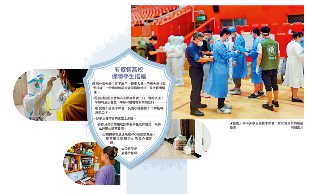 中山大學由於位於疫情管控區,加上校內此前曾出現2名人員檢測結果呈陽性,為此南校區部分地區實行臨時管控,學生宿舍樓採取「足不出戶、上門服務」的防控措施。「學校出現學生感染個案那天,我還和同學在圖書館自習,在飯堂吃飯後臨時收到學校通知讓大家回宿舍,當時還有點緊張,但很快就有老師來解釋事情經過。」在中山大學讀經濟專業的港生郭同學表示,校園出現感染個案後,部分密接者送去隔離,而校內學生則留在宿舍。「學校把我們照顧得很好,一日三餐都有教職工擔任志願者送餐上門。」