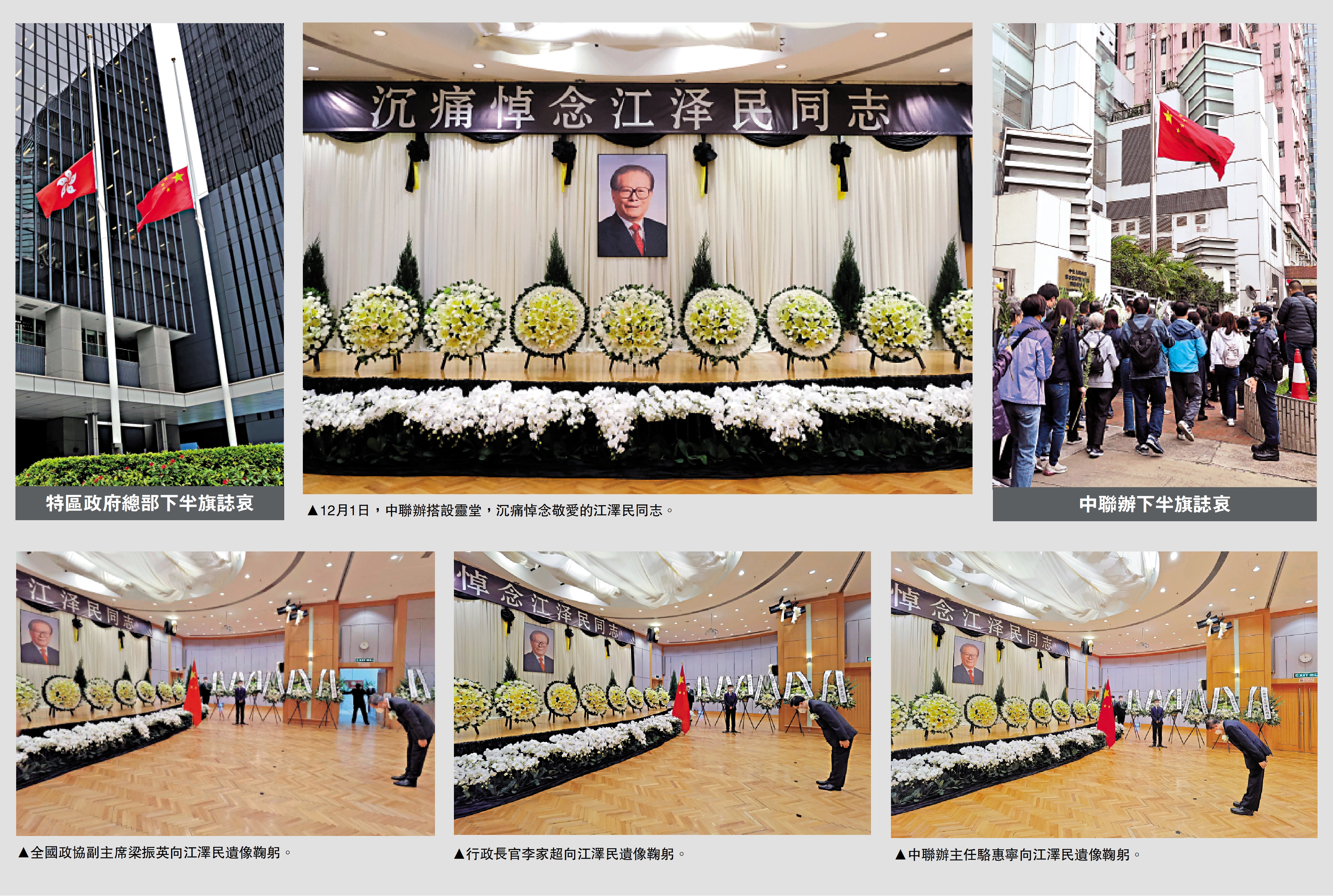 昨日下午,香港特區前行政長官林鄭月娥來到中聯辦搭設的靈堂,肅立默哀,向江澤民同志的遺像三鞠躬,沉重悼念。前行政長官曾蔭權致送花圈以示哀悼。特區政府三司司長、副司長,十五局負責人,行政會議成員,立法會主席和議員,司法機關主要負責人,民建聯、工聯會、新民黨、經民聯、自由黨,香港島各界聯合會、九龍社團聯會、新界社團聯會,香港友好協進會、港區省級政協委員聯誼會、香港僑界社團聯會,香港青年聯會、菁英會、華菁會等團體的代表近300人來到靈堂,深切悼念江澤民同志。