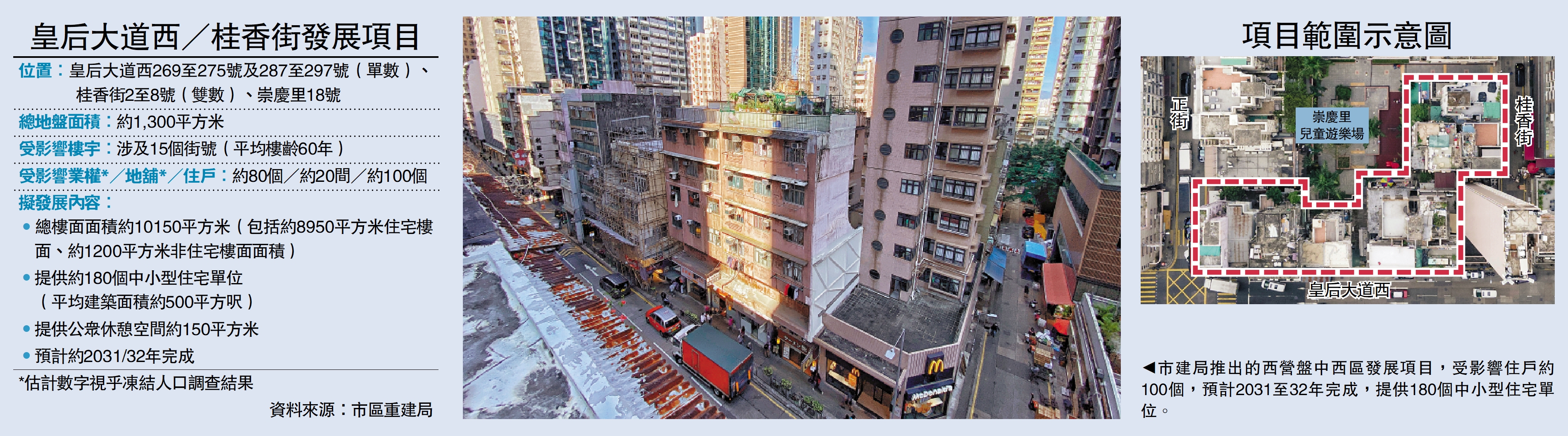 市區重建局昨日宣布啟動西營盤「皇后大道西/桂香街」發展項目,是兩個月內啟動的第二個重建項目。今次重建範圍內的大廈平均樓齡60年,普遍年久失修,預計二○三一至三二年完成後,將提供一百八十個中小型住宅單位。市建局估計,大約一百個住戶受重建影響。
