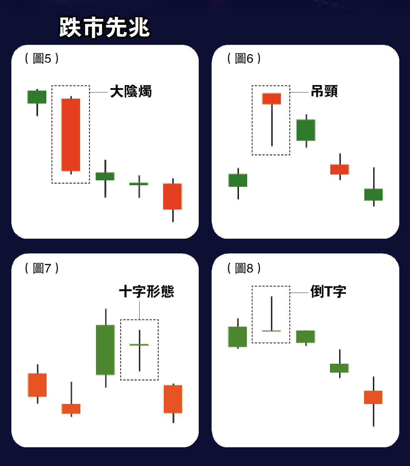 陰陽燭圖有向好形態,自然也有向淡形態。當中,大陰燭是其中一種常見的向淡形態(見圖5),由於收市價遠低於開市價,大陰燭可看是一根很長的長方形;這代表賣方在該時段控制了整個市場,而收市價比開市價愈低,代表賣方的力量愈強,其後股價再繼續下跌的機會也愈大。
