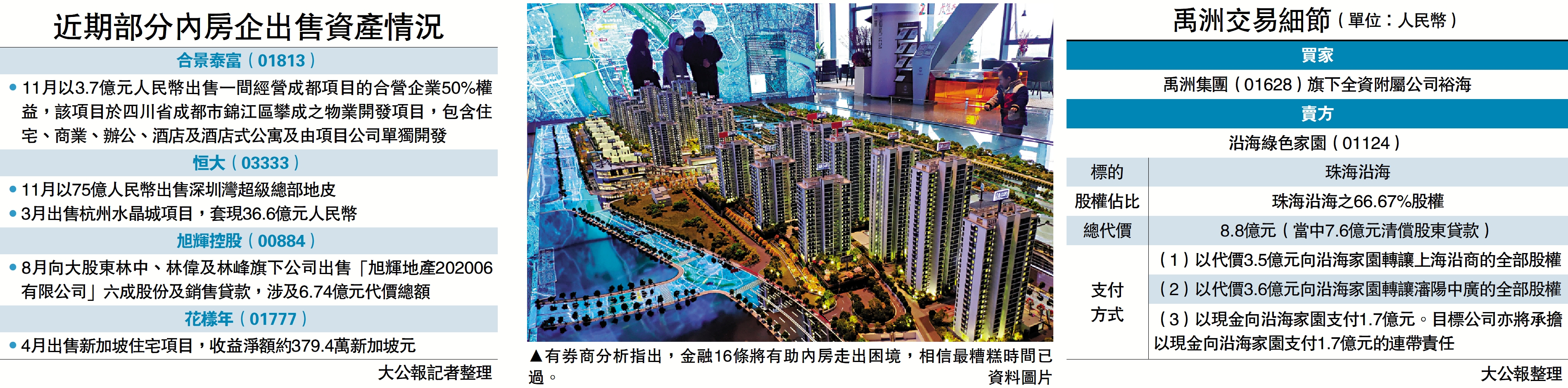 「三箭齊發」助力下,有內房把握時機購買資產。禹洲集團(01628)旗下全資附屬公司——裕海,向沿海綠色家園(01124)收購珠海沿海66.67%股權,總代價為8.8億元(人民幣,下同,約9.8億港元),當中7.6億元清償股東貸款。另外,奧園公開標售奧園健康29.9%股權。銀河聯昌報告指出,金融16條將有助內房走出困境,相信最糟糕時間已過,預期不斷增加的利好消息將繼續提振內房股價。德勤更指出,亞洲及全球的地產基金已做好準備抄底。\大公報記者 李 信