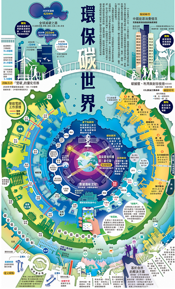 為應對氣候變化,中國提出「二氧化碳排放力爭於2030年前達到峰值」「努力爭取2060年前實現碳中和」等莊嚴的目標承諾。作為最大的發展中國家,中國將用30年左右時間來完成全球最高碳排放強度降幅。讓我們通過一組組圖表和數據,一起來領略環保「碳世界」綠色賽道上的技術挑戰與科技突破。