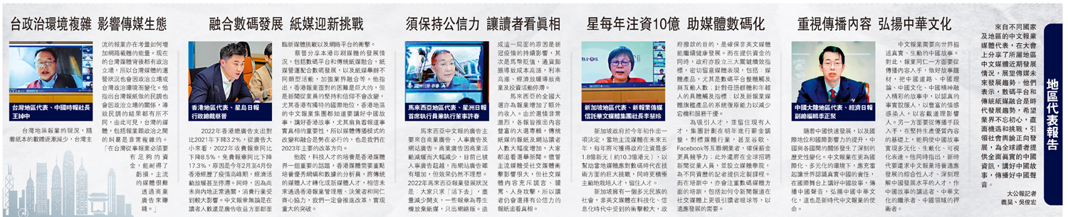 來自不同國家及地區的中文報業媒體代表,在大會上分享了所屬地區中文媒體近期發展情況,展望傳媒未來發展趨勢。他們表示,數碼平台和傳統紙媒融合是時代發展趨勢,希望業界不忘初心,直面機遇和挑戰,引領社會輿論正向發展,為全球讀者提供全面真實的中國資訊,講好中國故事,傳播好中國聲音。\大公報記者 義昊、吳俊宏