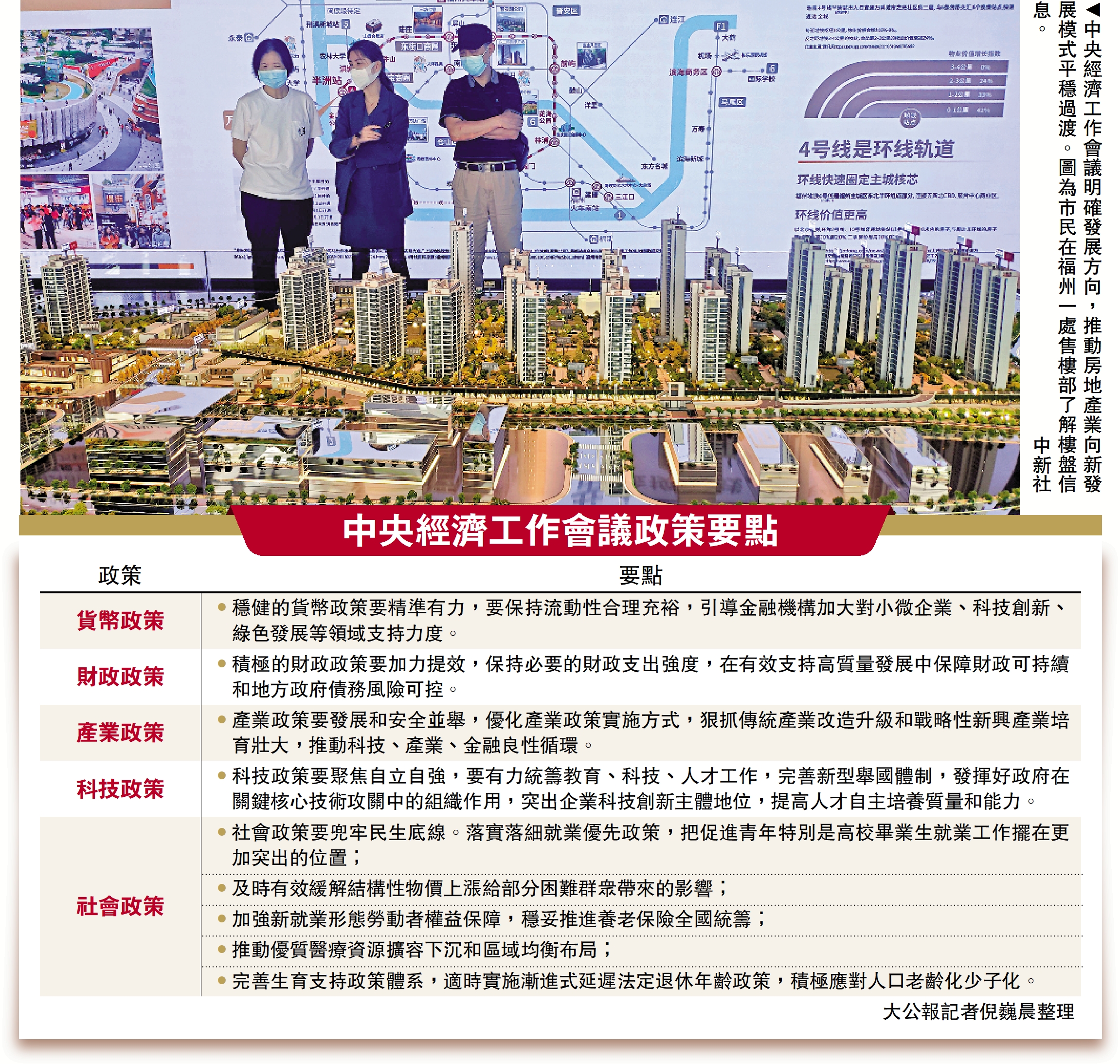 中央經濟工作會議12月15日至16日在北京舉行。中共中央總書記、國家主席、中央軍委主席習近平出席會議並發表重要講話。李克強、李強、趙樂際、王滬寧、韓正、蔡奇、丁薛祥、李希出席會議。對於明年經濟工作,會議提出,有效防範化解重大經濟金融風險。要確保房地產市場平穩發展,扎實做好保交樓、保民生、保穩定各項工作,滿足行業合理融資需求,推動行業重組併購,有效防範化解優質頭部房企風險,改善資產負債狀況,同時要堅決依法打擊違法犯罪行為。要堅持房子是用來住的、不是用來炒的定位,推動房地產業向新發展模式平穩過渡。\綜合新華社、大公報記者海巖、凱雷報道