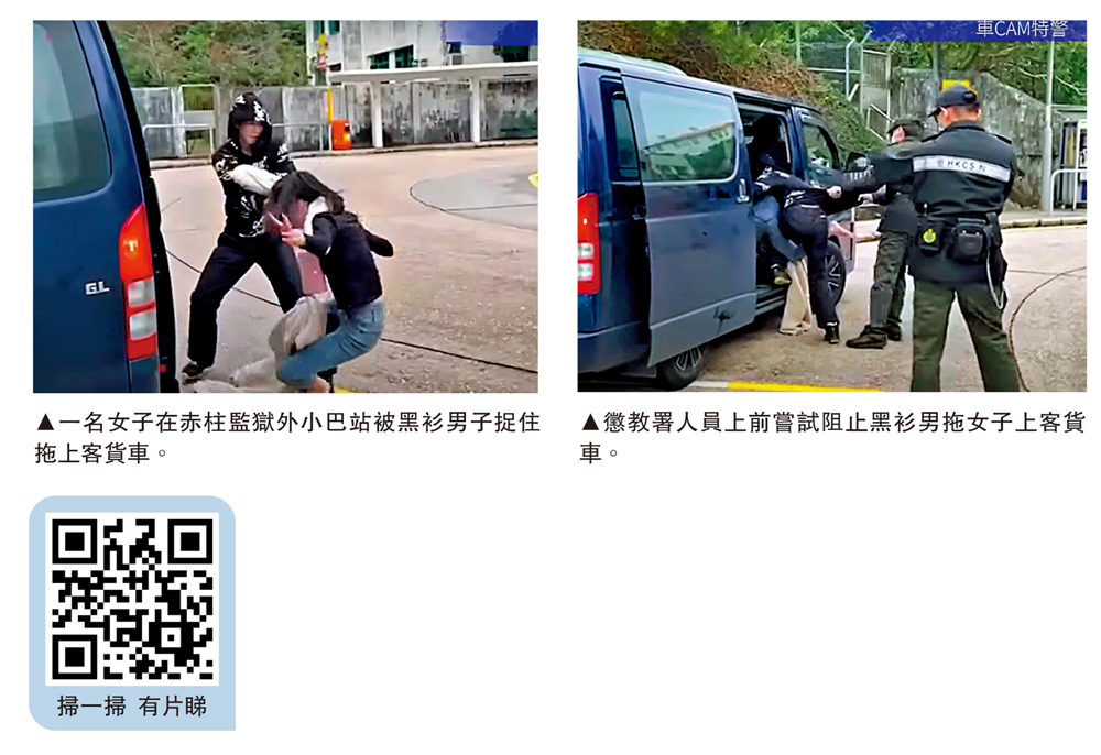 有現場人士上傳片段,顯示昨日上午在赤柱監獄外小巴站,兩名身穿黑衫黑褲男女將一名白色衫女子抬上客貨車,女事主不斷掙扎並大叫「救命」,波鞋亦鬆脫,一名身穿深藍色衫的男子嘗試制止,但遭另一黑衫褲男子施襲,拍片一方有人叫道「影車牌,影車牌」「救命啊!救命啊!報警,唔好畀佢走。」女事主一度從右邊車門逃出,但隨即被黑衫男子捉回拖上車,其後有懲教人員到現場查問,並嘗試出手制止黑衫男,但兩黑衫男無理會懲教人員,叫道「私人嘢,唔好搞。」懲教人員繼續扯住黑衫男制止,片段隨即完結。