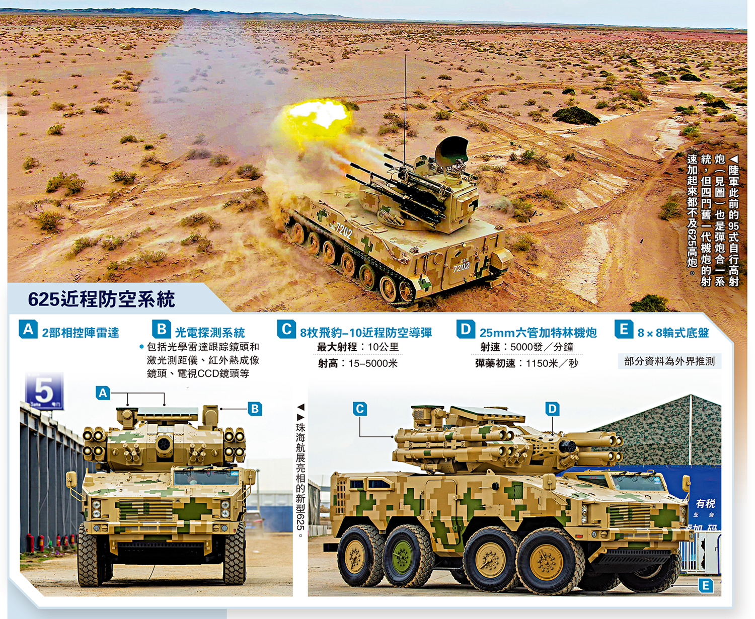 中國陸軍再添防空神器。新型625高炮系統,安裝有6管25毫米加特林式機關炮,以及8枚短程防空導彈。其機炮能夠以5000發/分鐘的射速輸出超密集火力,組成彈雨攔截網,而防空導彈則以制導紅外精確狙殺空中飛行目標,打擊武裝直升機、巡航導彈、巡飛彈、無人機等低空飛行器,從而為合成旅部隊提供嚴密的野戰機動伴隨防護。\馬浩亮(文)