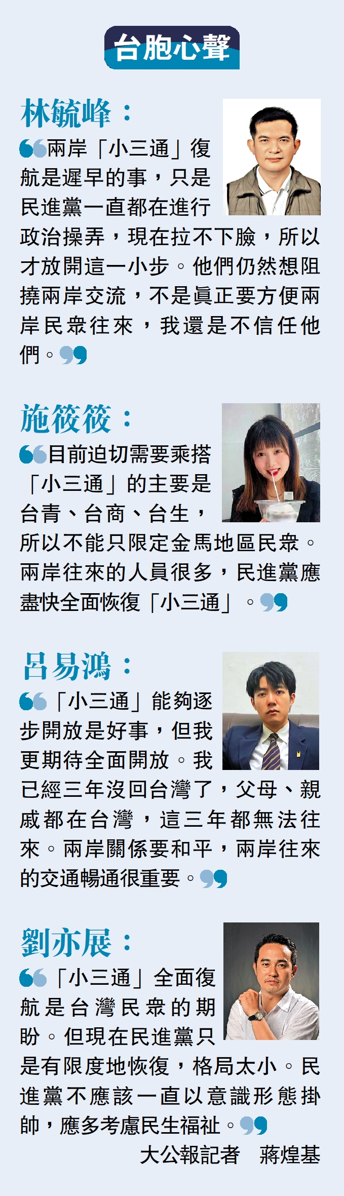 「小三通」能夠逐步開放是好事,但我更期待全面開放。我已經三年沒回台灣了,父母、親戚都在台灣,這三年都無法往來。兩岸關係要和平,兩岸往來的交通暢通很重要。