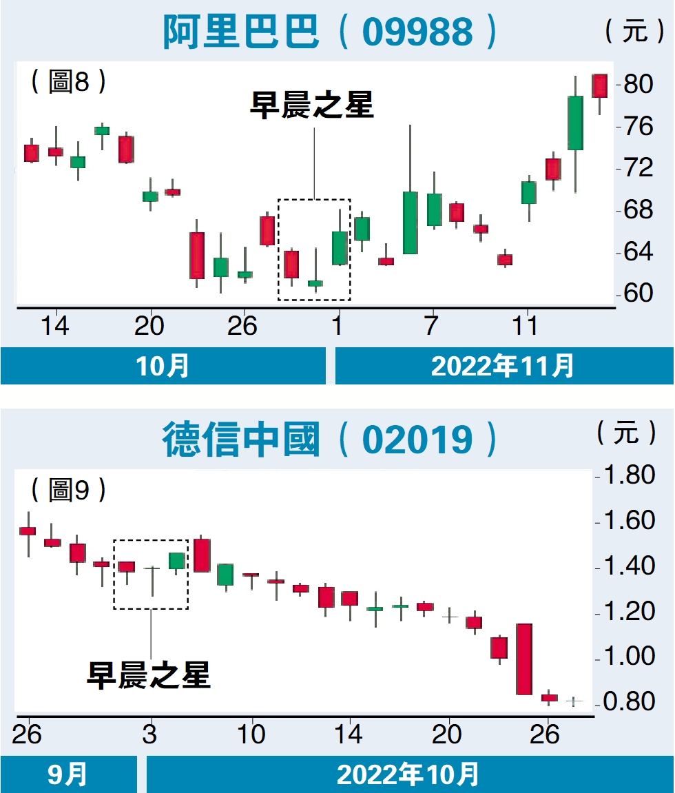 阿里巴巴在11月初,陰陽燭圖表上便出現「早晨之星」的買入信號(見圖8),這類優質企業發出的陰陽燭買入信號,可信程度會較高。但一些正受到市場消息影響的企業,特別是市值較低,營運前景未見樂觀,而且股份的交投量偏低的冷門股,當出現陰陽燭買入信號,可信程度便不大。如德信中國(02019),成交量向來較少,今年也曾多次出現「早晨之星」的買入信號(見圖9),但股價在信號出現後仍持續下跌。